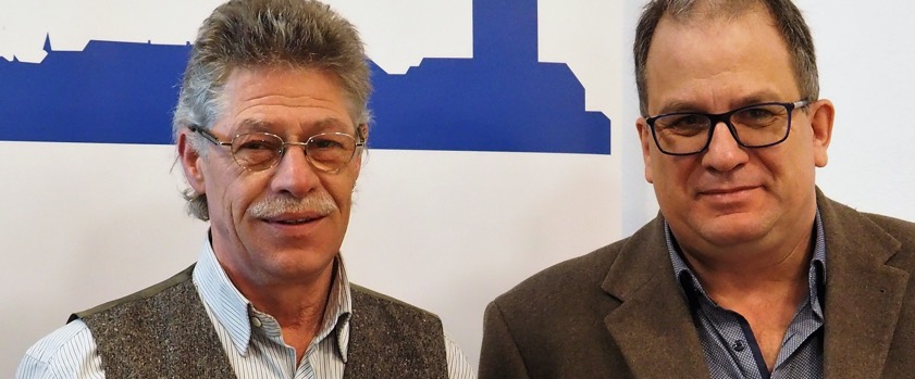 Reinhold Schmucker (links) tritt in den Ruhestand und verlässt damit auch den Gewerbeverein. Er zeigte sich "wahnsinnig stolz, Mitgründer gewesen zu sein". Der im Amt bestätigte Vorsitzende Mike Jäger überreichte dem scheidenden Beirat ein kleines Präsent.