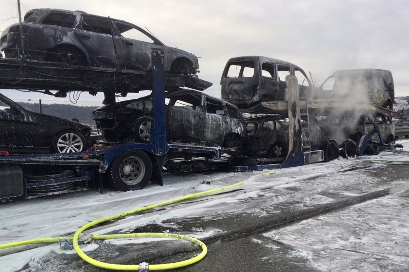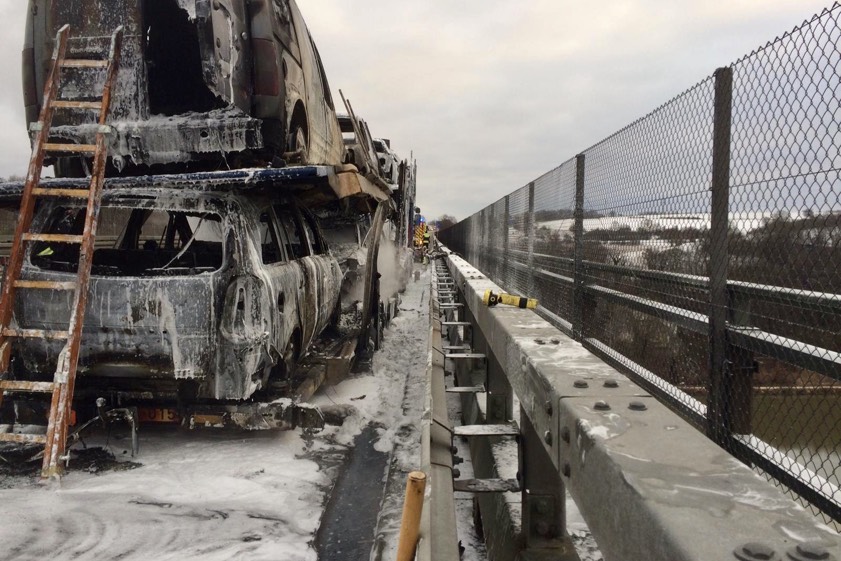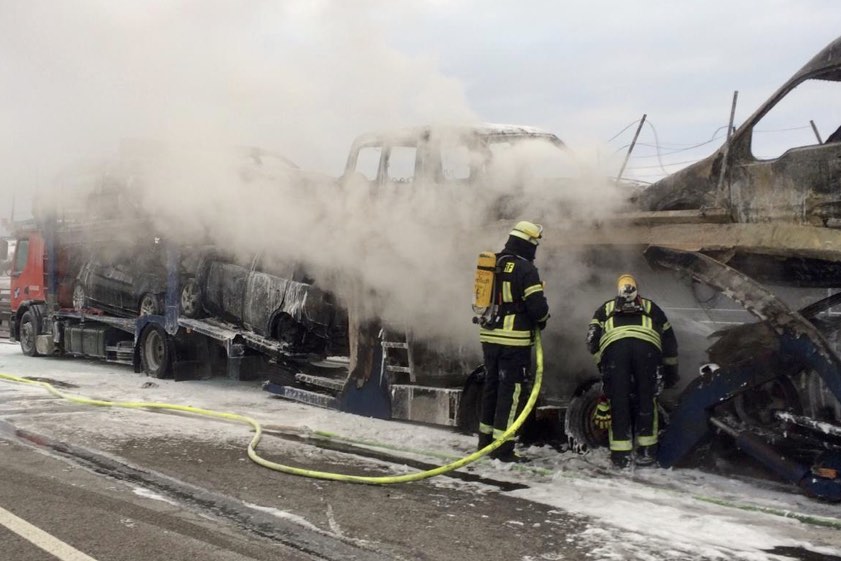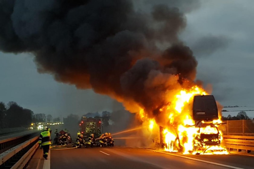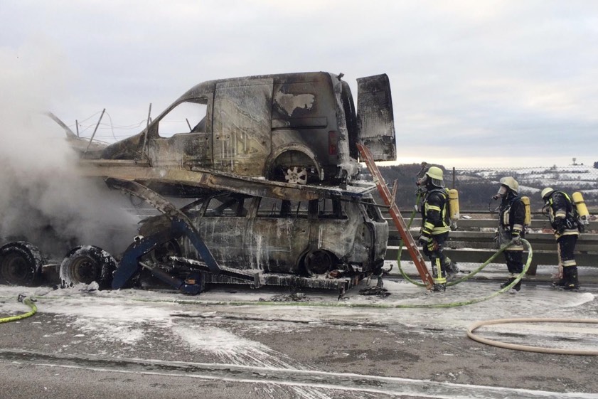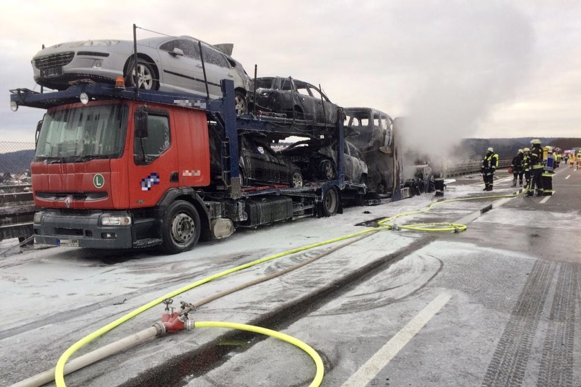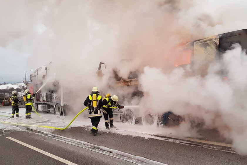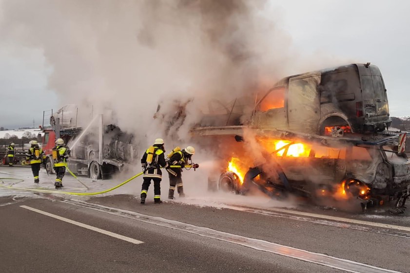 Die Autobahn musste in beide Richtungen komplett gesperrt werden. Lkw-Gespann und acht geladene Fahrzeuge wurden zum Raub der Flammen.