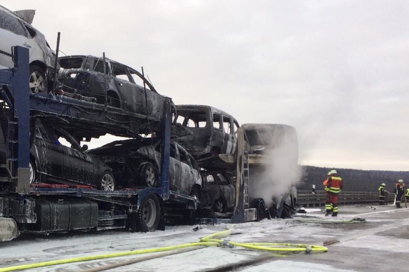 (ty) Gegen 7.30 Uhr war am heutigen Morgen der oberpfälzischen Polizei-Einsatz-Zentrale Oberpfalz ein Pannen-Lkw auf der Autobahn A3 in Fahrtrichtung Regensburg gemeldet worden. Während sich die Beamten noch auf der Anfahrt befanden, teilten dann Passanten mit, dass ein ungarischer Autotransporter auf der Sinzinger Autobahnbrücke in Brand geraten sei. Die ersten Beamten der Regensburger Verkehrspolizei mussten dann bestätigen: Der Transporter steht im Vollbrand. Der Laster war den Angaben zufolge mit insgesamt acht Fahrzeugen beladen. "Offenbar von einem Reifen ausgehend, breitete sich der Brand auf das gesamte Gespann aus", so ein Polizei-Sprecher. Der Lkw-Lenker hatte sich unverletzt in Sicherheit bringen können.