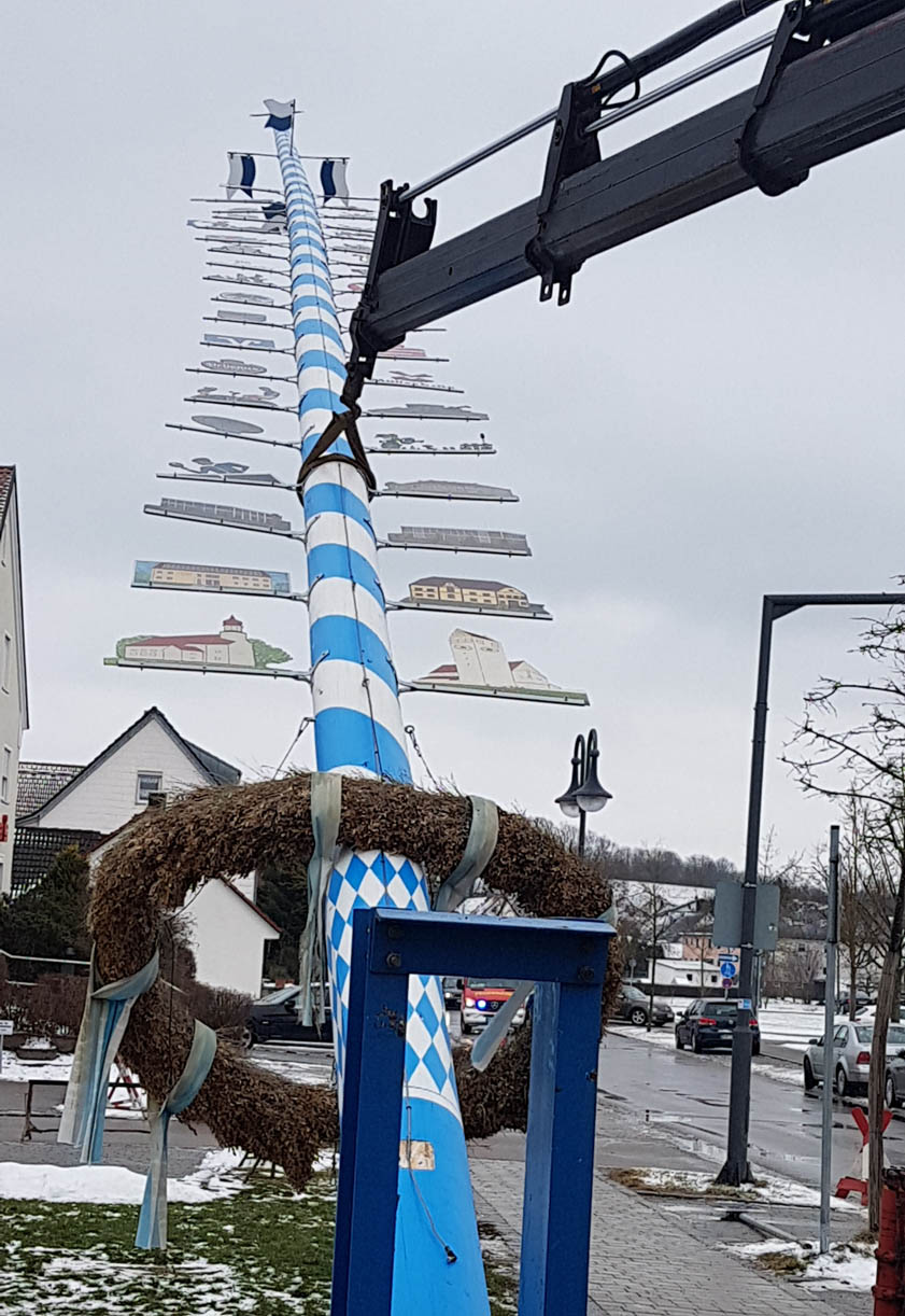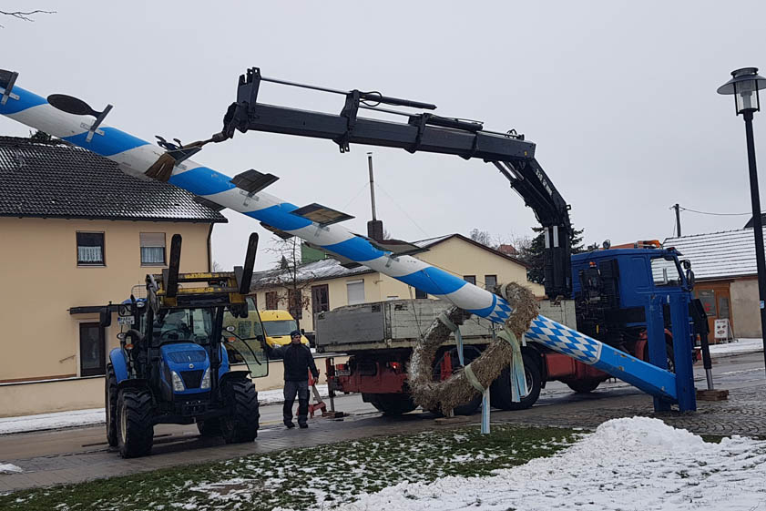 (ty) Traditionell wird alle zwei Jahre ein neuer Maibaum in Ilmmünster aufgestellt. Aus diesem Grund musste nun der alte Maibaum weichen. Mit Hilfe eines Krans von Baukran-/ Baumaschinenverleih Steinberger aus Ilmmünster und Unterstützung von Uli Fischer mit seinem Frontlader war die Mission, die von Richard Grassl geleitet wurde, erfolgreich. Durch die Straßensperrung der Freiwilligen Feuerwehr Ilmmünster und die ruhige Hand von Kranführer Hans Steinberger konnte der 30 Meter lange Baum am Rathaus im ganzen Stück umgelegt werden.