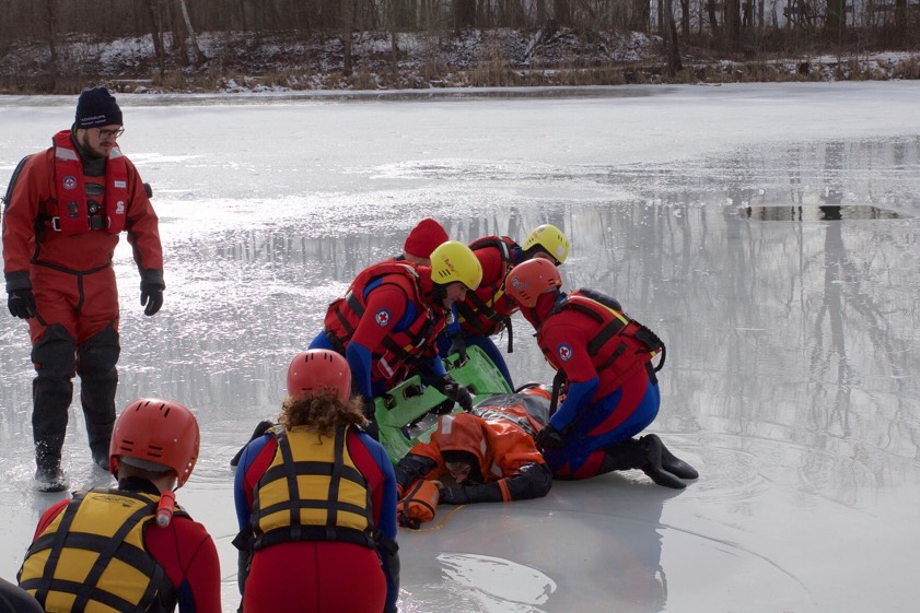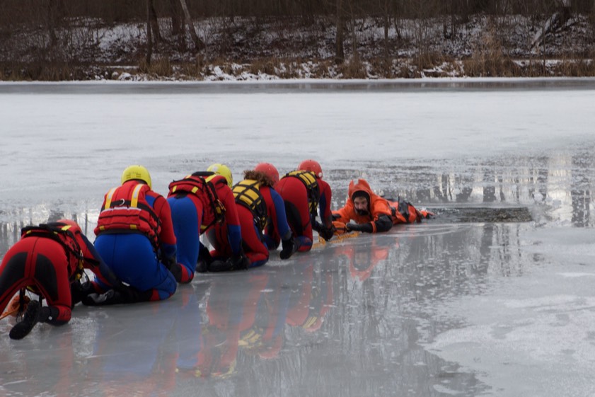 (ty) Gestern haben die Wasserwachten aus Ingolstadt und Großmehring die so genannte Eisrettung am Auwaldsee bei Ingolstadt trainiert. Insgesamt 30 Mitglieder der beiden Ortsgruppen übten dabei sowohl Rettungs-Möglichkeiten, die auch Laien durchführen können – wie das Zuwerfen eines Rettungsrings oder die Bildung einer Menschenkette –, als auch professionelle Rettungs-Maßnahmen mit Hilfe eines speziellen Schlittens und eines Spineboards.