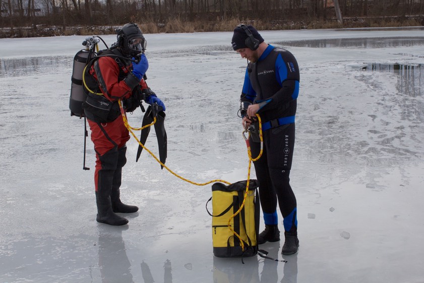 Nach den eigenen Übungs-Einheiten konnten die Wasserretter-Anwärter dann noch die Tauchergruppe beim Eistauchen unterstützen. „Wasserretter sind eine wichtige Unterstützung für die Signalleute“, so Wecker. Insgesamt fünf Taucher führten gestern im Auwaldsee mehrere Tauchgänge unter dem etwa zehn Zentimeter dicken Eis durch. Die Wasserwacht warnt laut heutiger Mitteilung auch weiterhin vor dem Betreten natürlicher Eisflächen. „Gerade die steigenden Außentemperaturen haben die Eisdecken weiter geschwächt“, betont Wecker: „Unsere Mitglieder sind bei der Eisrettungs-Übung mehrfach eingebrochen.“