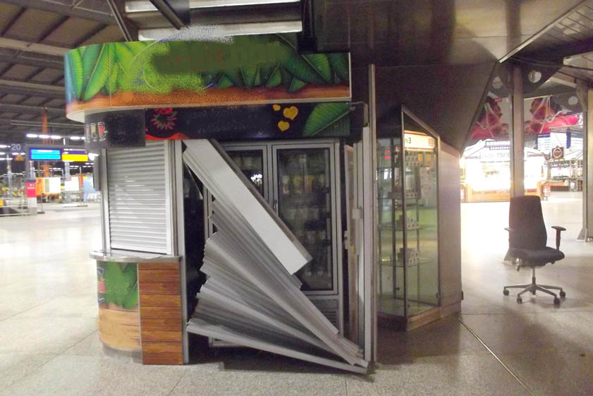 (ty) Heute Nacht kam es am Hauptbahnhof München zu einer ungewöhnlichen Sachbeschädigung. Gegen 3 Uhr war ein Mann mit einem Drehstuhl in hoher Geschwindigkeit über den Querbahnsteig des Münchner Hauptbahnhofes gefahren. Anscheinend geriet ihm sein "Gefährt" dabei außer Kontrolle, denn er schlug damit in einen Verkaufsstand auf dem Querbahnsteig ein. Dabei wurde die Jalousie des Standes beschädigt (Foto oben). Der Mann konnte sich unerkannt vom Tatort entfernen. Der Bürostuhl wurde sichergestellt. Woher dieser stammte und zu welchem Zwecke er auf den Querbahnsteig gebracht wurde, ist derzeit nicht bekannt. Gegen den Unbekannten ermittelt die Bundespolizei wegen Sachbeschädigung.