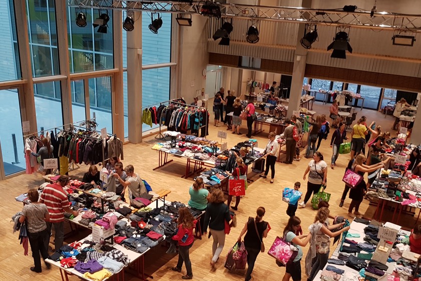 In der Aula der Grund- und Mittelschule gibt es unter anderem Bekleidung, Baby-Ausstattung und Spielsachen, aber auch Bücher und Umstandsmode.