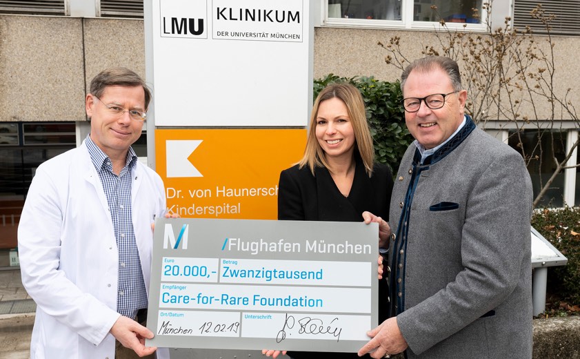 (ty) Der Flughafen München unterstützt die gemeinnützige Care-for-Rare-Foundation mit insgesamt 20 000 Euro bei der Erforschung von seltenen Kinderkrankheiten. Den Scheck übergaben Thomas Bihler (Foto, rechts) und Nitsa Lialiagka von der Flughafen-München-GmbH, an Professor Christoph Klein (links), Leiter der Klinik und Poliklinik für Kinderheilkunde und Jugendmedizin am Dr.-von-Hauner'schen Kinderspital, der zugleich Gründer der Care-for-Rare-Foundation ist.