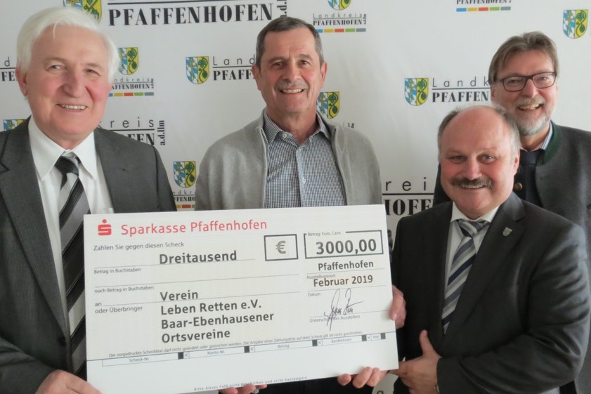 (ty) Wie im vergangenen Jahr beim Faschings-Umzug in Baar-Ebenhausen angekündigt, hat nun Robert Brenner (Foto oben, Zweiter von links) stellvertretend für aller Helfer beim Baar-Ebenhausener Faschingszug den Reinerlös in Höhe von 3000 Euro an den Verein "Leben retten e.V." übergeben. Den symbolischen Scheck nahm der Vorsitzende des Vereins, Altlandrat Rudi Engelhard (links), im Beisein von Landrat Martin Wolf (rechts) und Baar-Ebenhausens Bürgermeister Ludwig Wayand entgegen.