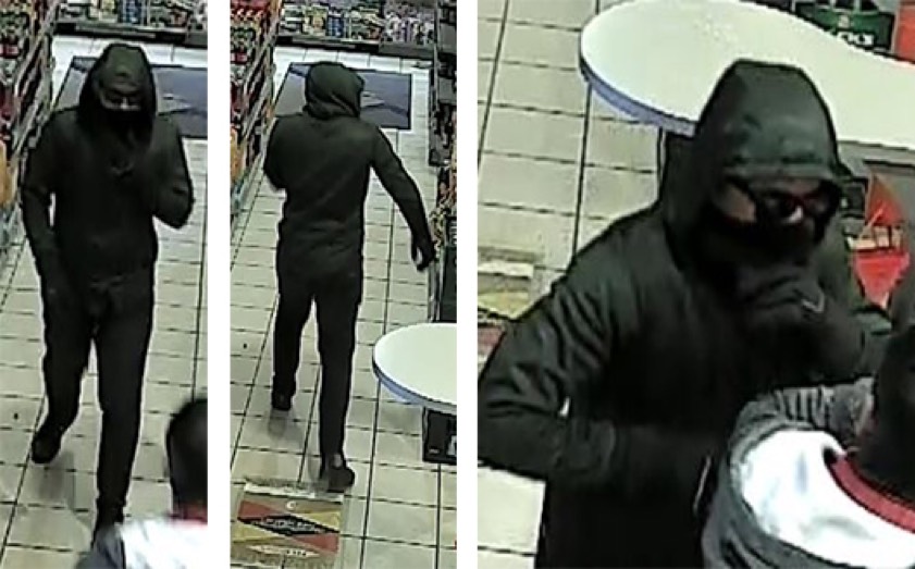 - Täter 2: Männlich, etwa 25 Jahre alt, zirka 180 Zentimetergroß, schlank, hellhäutig. Dunkle Sonnenbrille, dunkler Schal über dem Mund. Bekleidet mit schwarzer Mütze und schwarzer Jacke mit Kapuze.