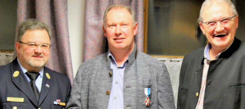 Dieses Jahrzehnte währende Engagement honorierte auch der Landesfeuerwehrverband und verlieh Amesreiter nun das Feuerwehr-Ehrenkreuz in Silber. Kreisbrandrat Wiesbeck (Foto, links) würdigte in seiner Laudatio die Verdienste des von Amesreiter: Neben der Leitung von unzähligen, zum Teil schwierigen und herausfordernden Einsätzen habe er durch seine fachkundigen Entscheidungen auch stets dafür gesorgt, dass die richtigen Weichen gestellt worden seien. Bürgermeister Manfred Russer (Foto, rechts) gratulierte Amtesreiter im Namen der Gemeinde zu der Ehrung.