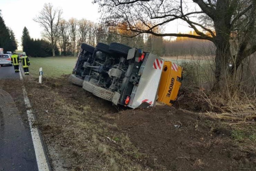(ty) Zu einem spektakulären Unfall mit einem Schwerlastkran ist es gestern im Landkreis Dachau gekommen. Nach Angaben der Polizei war ein 67-Jähriger aus Magdeburg gegen 7.15 Uhr mit dem mächtigen Gefährt auf der Kreisstraße zwischen Sigmertshausen und Rumeltshausen unterwegs, als das Unglück geschah. Im Sigmertshauser Holz sei der Kran ins Bankett geraten und der Lenker konnte ihn nicht mehr unter Kontrolle bringen. Das Fahrzeug rutschte in den Graben und kippte schließlich nach links um.