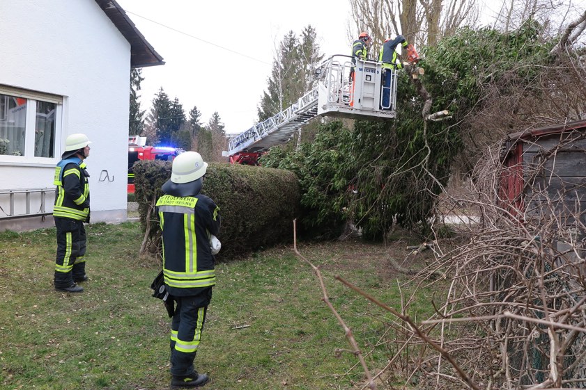 (ty) Arbeit bescherte das Sturmtief, das am Rosenmontag über Freising hinwegzog, der örtlichen Feuerwehr. Zu insgesamt vier Einsätzen wurden die Floriansjünger gerufen, gleich drei Mal stürzten Bäume um und mussten abgetragen werden (Fotos). Gegen 14.30 Uhr wurden die Helfer zu einem Baum an der Bachstraße alarmiert, der auf das Nachbarhaus gestürzt war. In einer aufwändigen Aktion wurde der Baum mit Hilfe der Drehleiter vom Hausdach geschnitten.