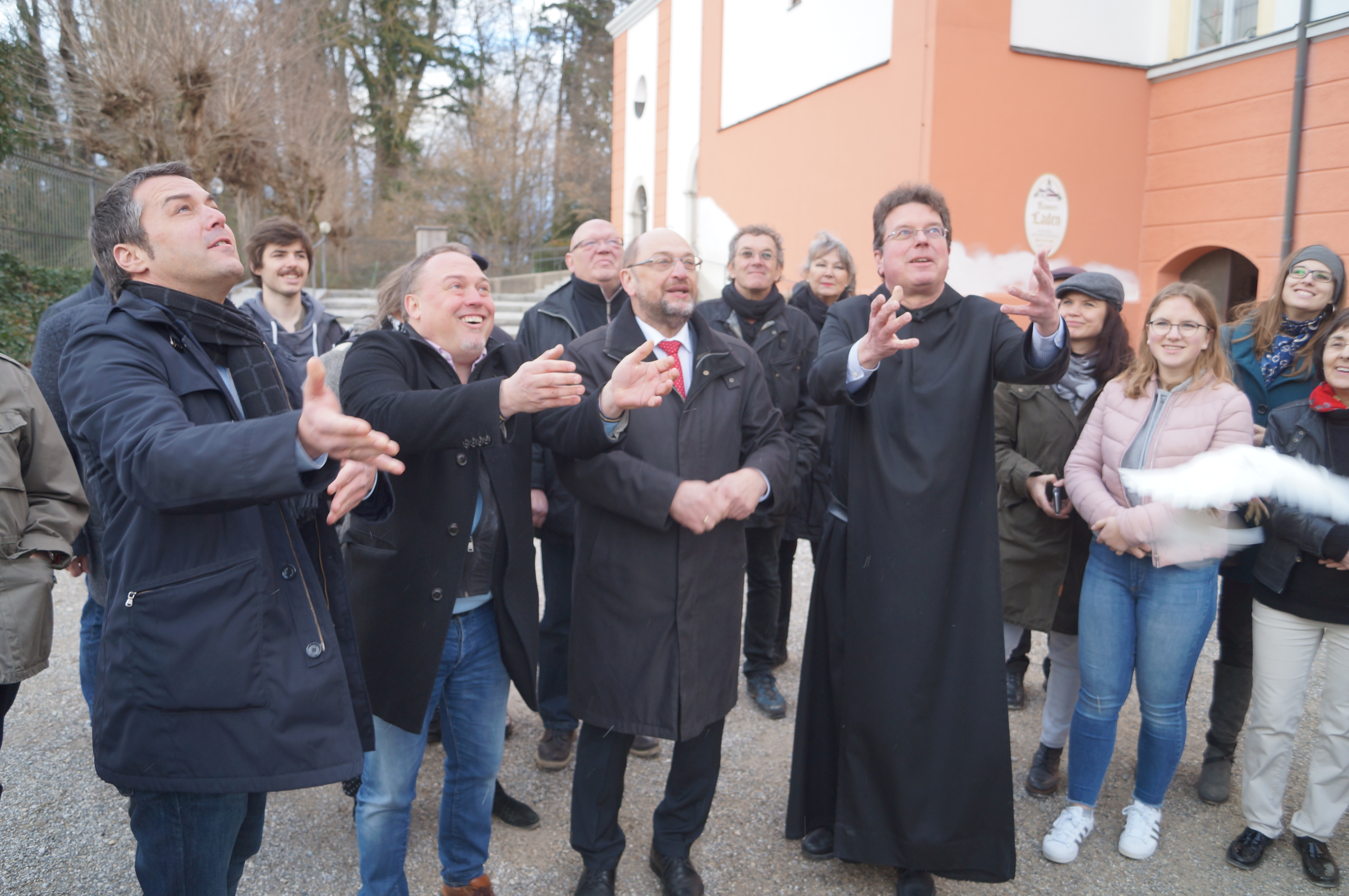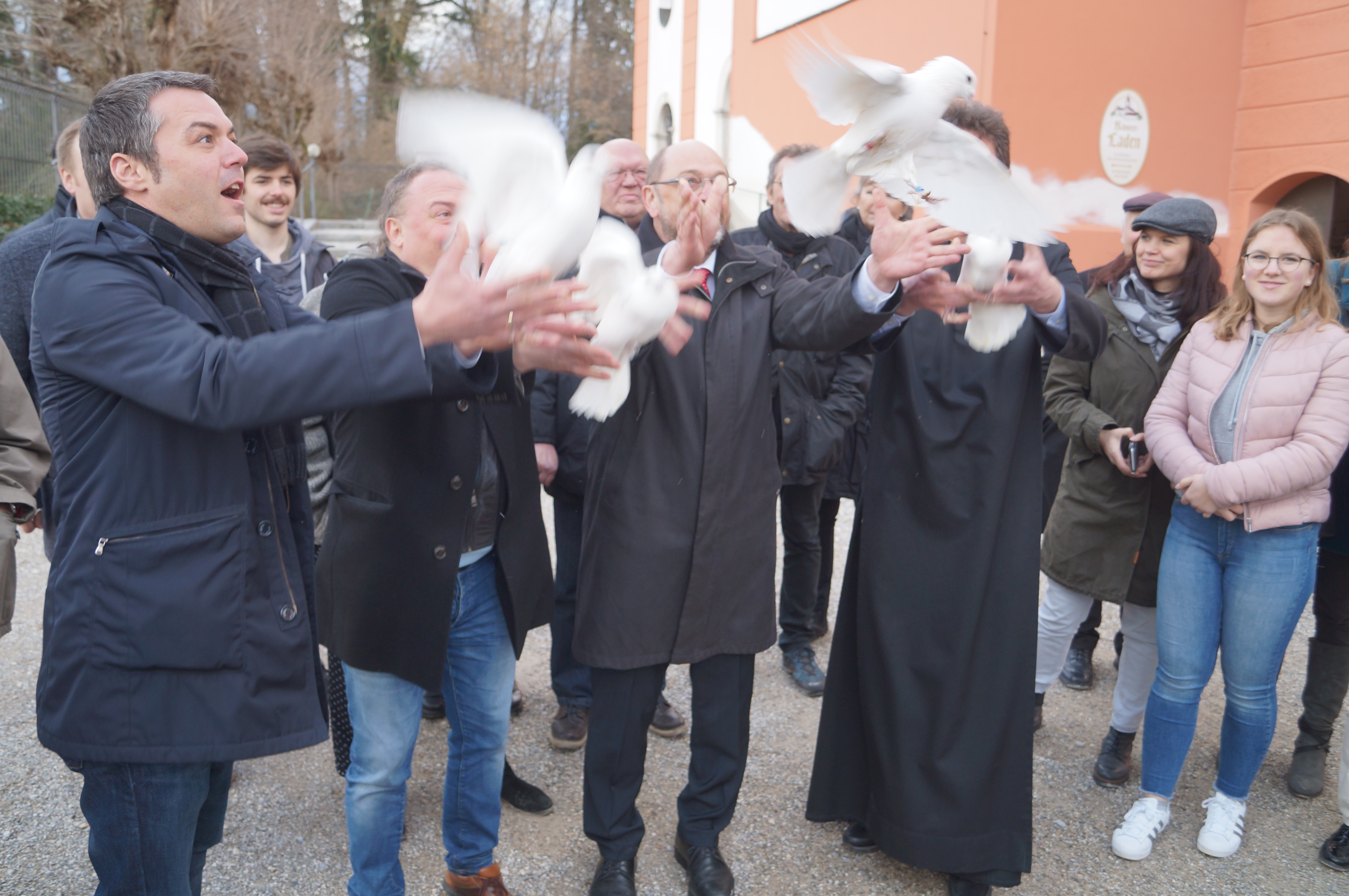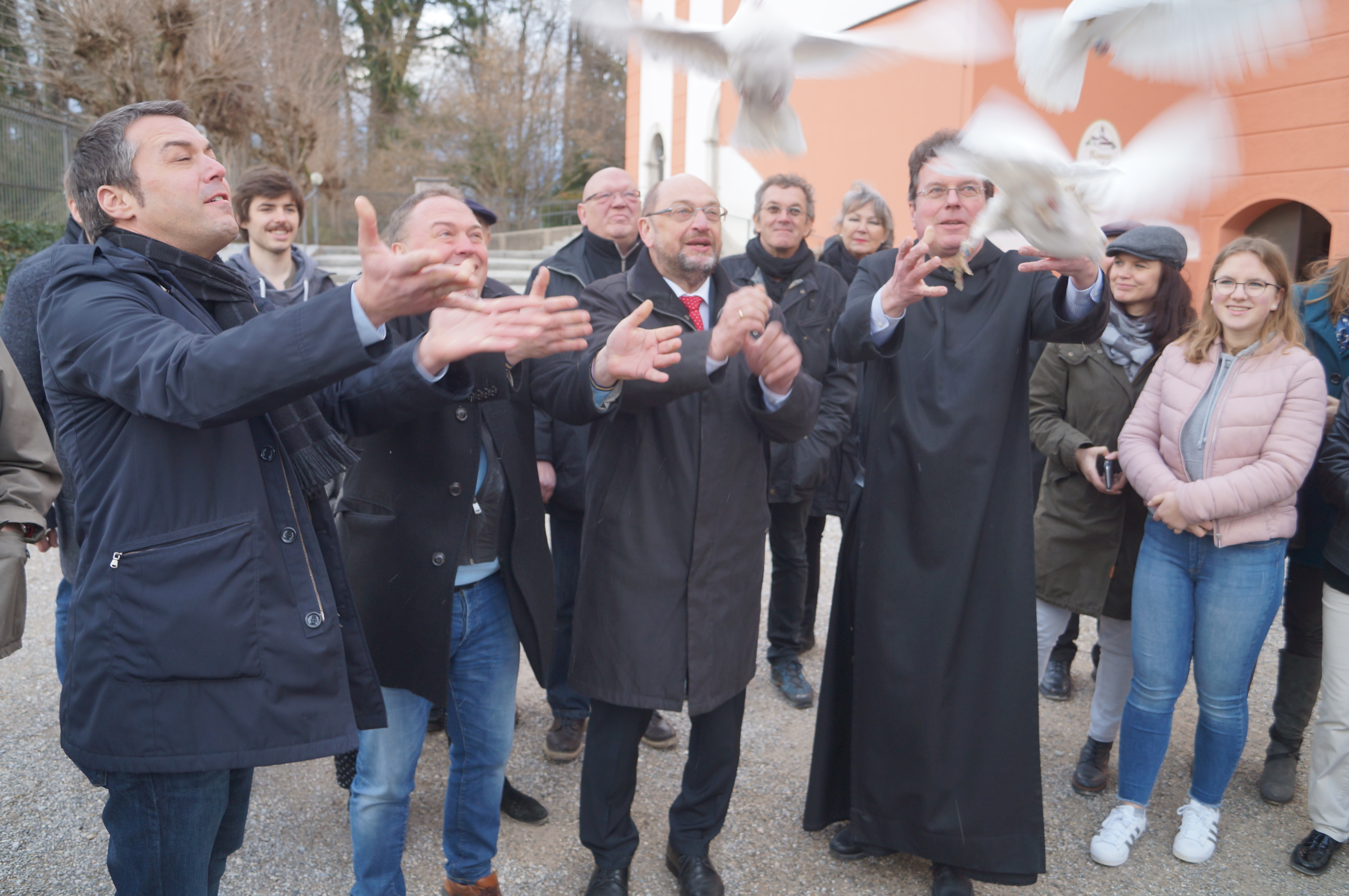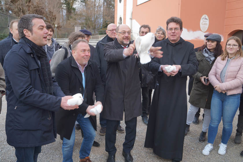 Schulz, einst selbst ein Ordensschüler, lauschte aufmerksam den Ausführungen von Pater Lukas und trug auch selbst die eine oder andere Anekdote bei. Zum Beispiel über sein besonderes Verhältnis zu Otto von Habsburg. "Wir haben uns in den ersten Monaten im Europa-Parlament unwahrscheinlich gestritten. Aus diesem Konflikt ist dann eine enge, persönliche Verbindung geworden." Der offizielle Teil endete dann mit vier weißen Tauben, die von Pater Lukas, Martin Schulz, Thomas Herker und Markus Käser in die Lüfte geschickt wurden. Als Appell für den Frieden und ein geeintes Europa. Im Mai wird das nächste europäische Parlament gewählt.