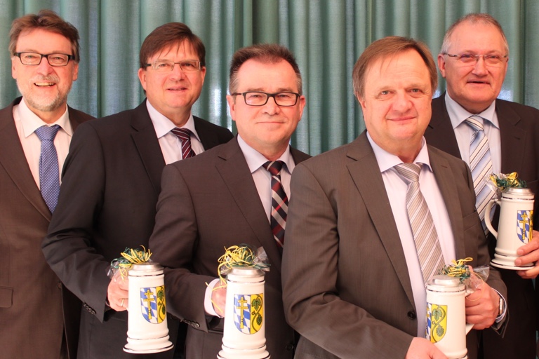 Ein Blick ins Archiv: Landrat Martin Wolf (von links) gratulierte im Jahr 2016 vier Bürgermeistern im Landkreis Pfaffenhofen zum 20-jährigen Dienst-Jubiläum: Albert Vogler (Schweitenkirchen), Karl Huber (Ernsgaden), Anton Steinberger (Ilmmünster) und Manfred Russer (Hohenwart). Nur ein Rathauschef ist noch länger im Amt: Reinhard Heinrich, Gemeinde-Oberhaupt von Reichertshausen.