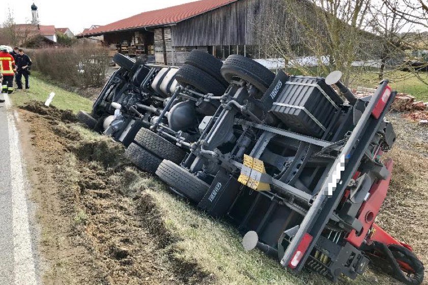 Das Malheur ereignete sich kurz nach 11 Uhr. Laut Polizei war ein 66-jähriger Oberpfälzer mit einem DAF-Lastwagen auf der Kreisstraße von Wolnzach in Richtung Au unterwegs, als das Unglück geschah. Kurz vor Rudertshausen kam der Lkw, der mit Marmorplatten beladen war, nach rechts von der Strecke ab und das Unheil nahm seinen Lauf: Er geriet ins Bankett, kippte nach rechts in den Graben und blieb dort auf der rechten Seite liegen.