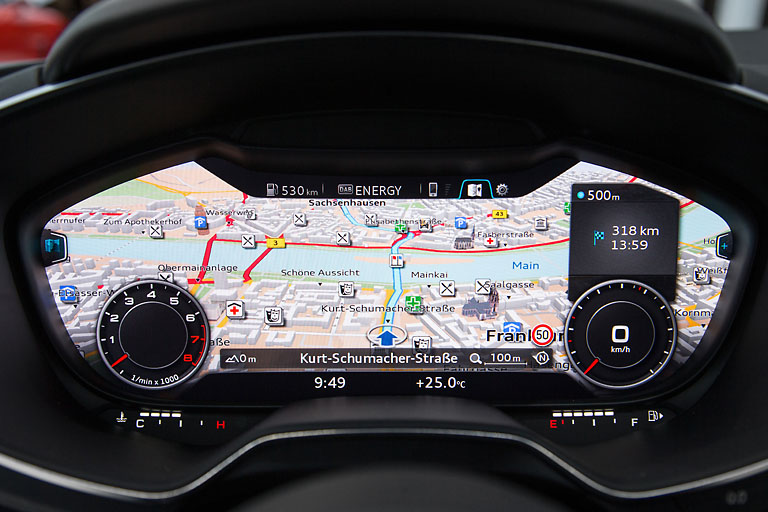 Der Fahrer kann das 12,3 Zoll große TFT-Display zwischen zwei Anzeigemodi umschalten. In der klassischen Ansicht stehen Tacho und Drehzahlmesser im Vordergrund, im „Infotainment“-Modus sind die virtuellen Instrumente kleiner. Auf der Fläche, die dadurch entsteht, erhalten Funktionen wie die Navigationskarte eine große Bühne.