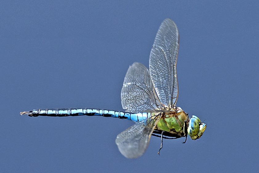 Wenn man diese Art der Fotografie dann auf die Spitze treiben möchte, dann versucht man sich an fliegenden Libellen. Dafür benötigt man dann allerdings eine extrem schnelle Kamera, viel Ausdauer und eine gute Beobachtungsgabe. Da die Libellen oft in einem Bereich patrouillieren und immer wieder kurz an derselben Stelle anhalten, kann man mit viel Geduld auch eine Libelle im Flug erwischen."