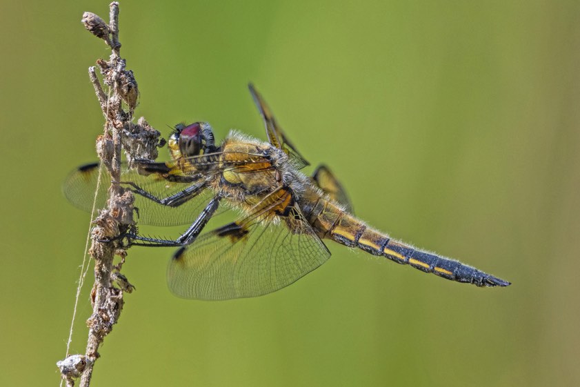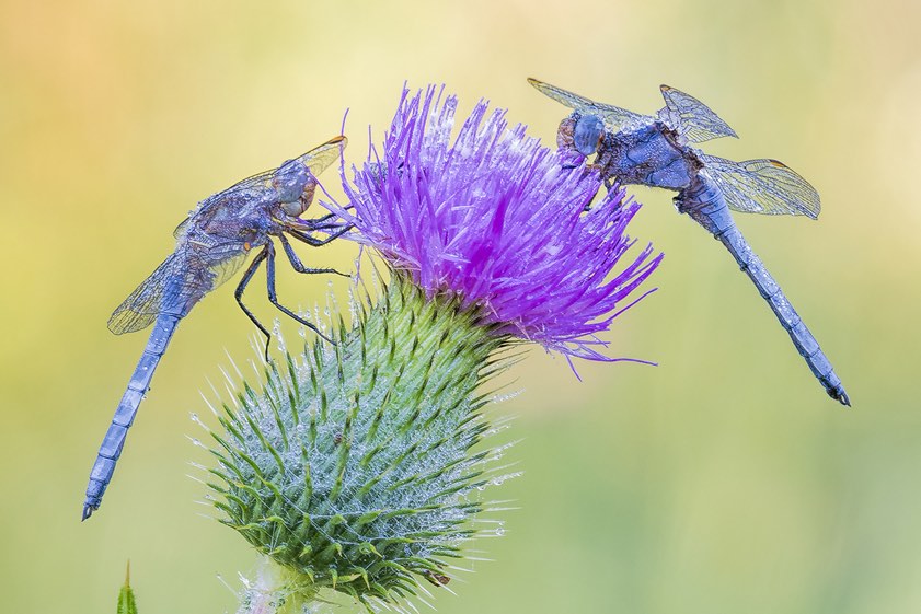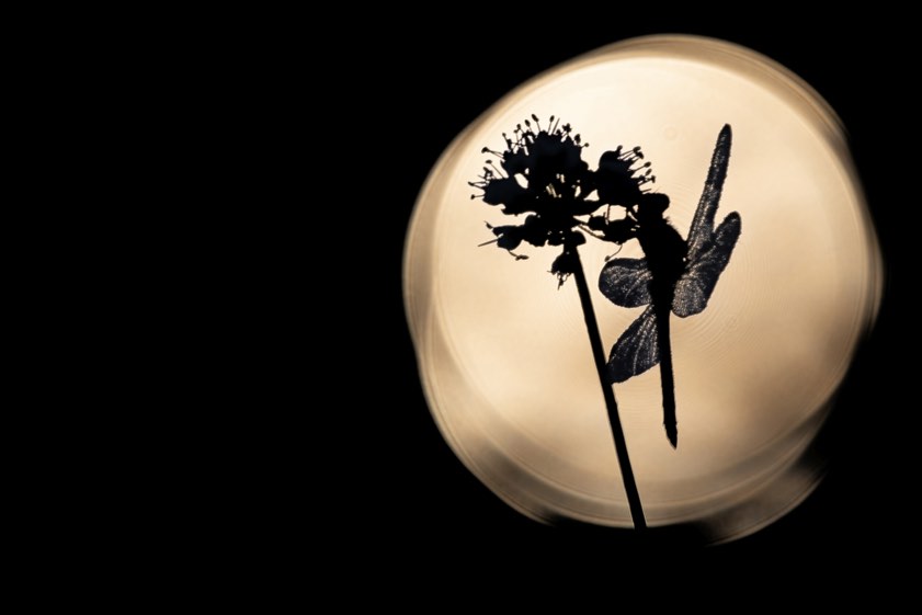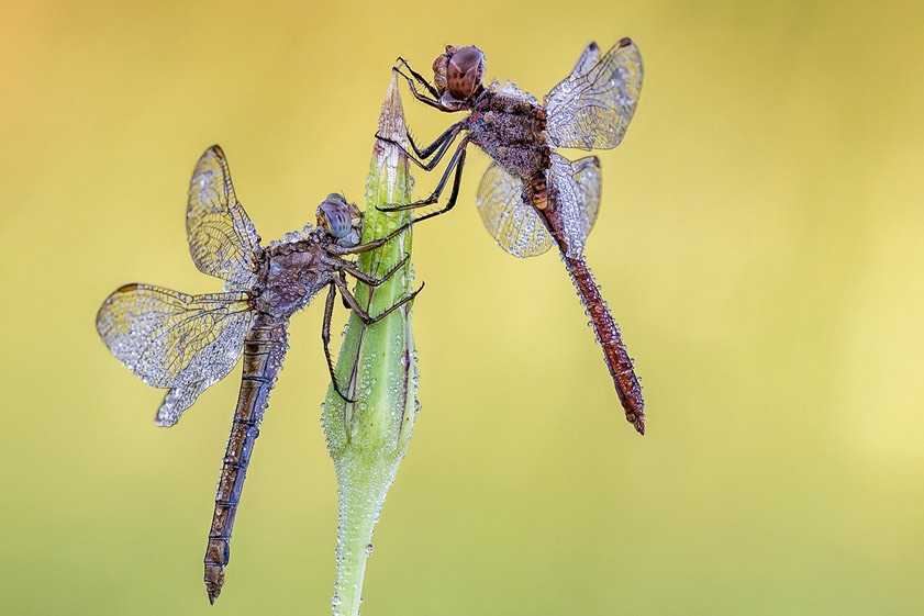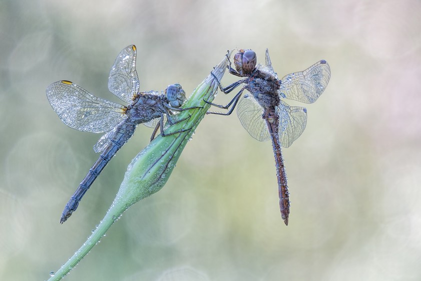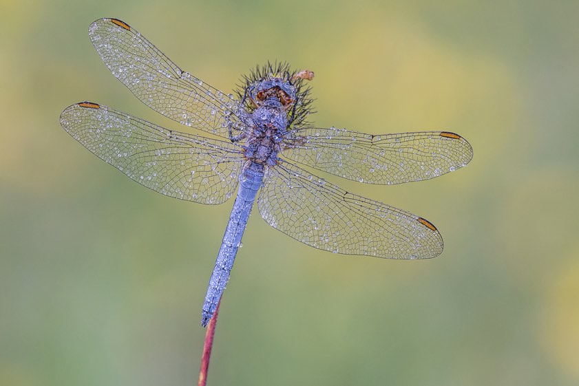 "Um gute und interessante Libellen-Aufnahmen zu machen, muss man deutlich vor Sonnenaufgang unterwegs sein. Die Libellen befinden sich vor Sonnenaufgang noch in einer Starre – und wenn man Glück hat, dann hat der Nebel in der Nacht Nacht Tautropfen auf den Libellen und Pflanzen gebildet. Je nach Lokation ist man also ab 4 Uhr am frühen Morgen unterwegs. Aber nur dann sitzen die Libellen noch auf den Pflanzen und nur dann hat man das richtige Licht, um geniale Aufnahmen der Libellen zu machen.