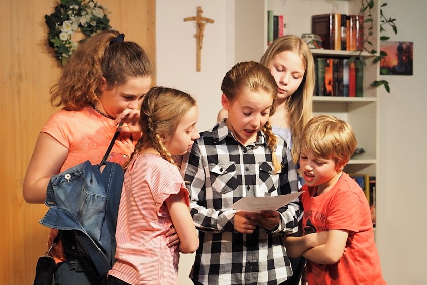 Sichtlich überrascht sind die Kinder Lisa Rankl, Hannah Maier, Lena Schleibinger, Fiona Maier und Luis Maier, als sie einen Brief ihrer Mutter finden.