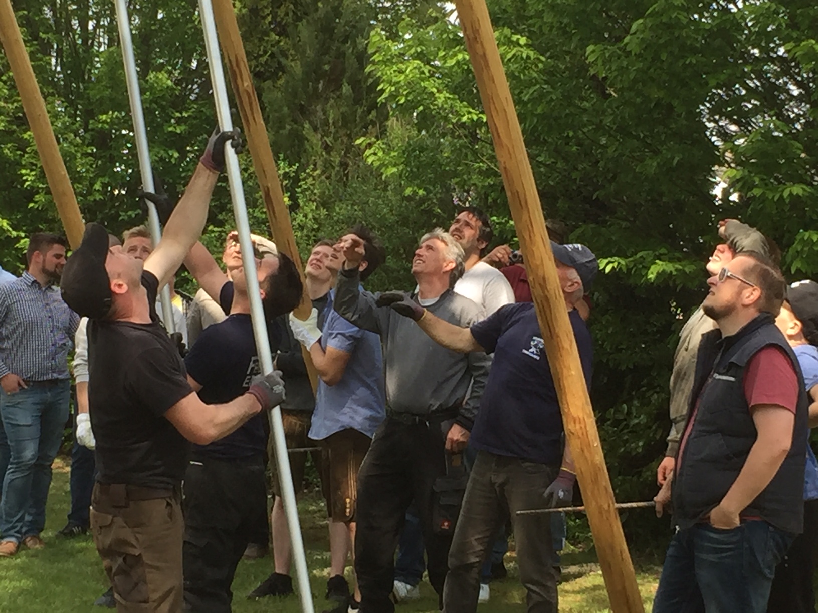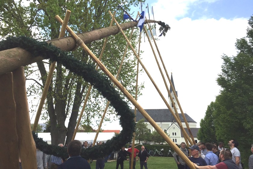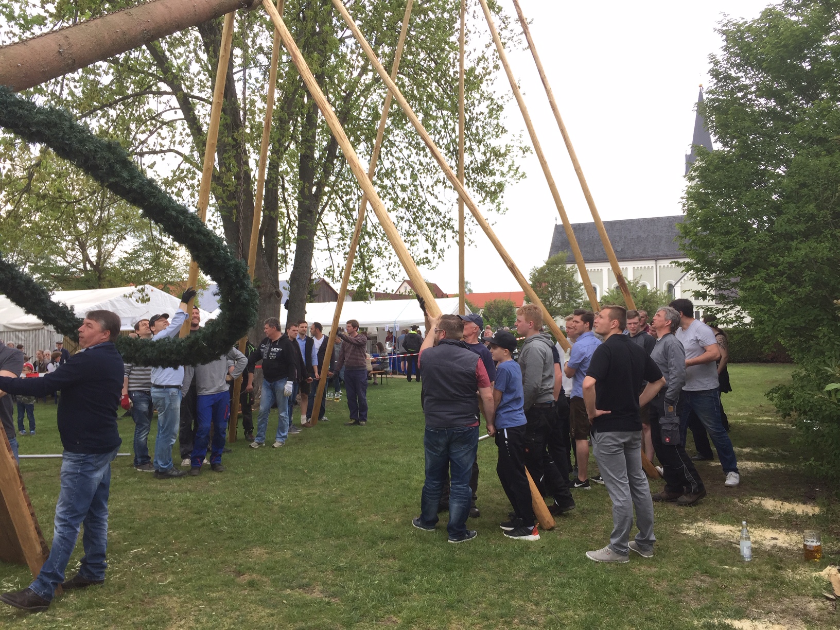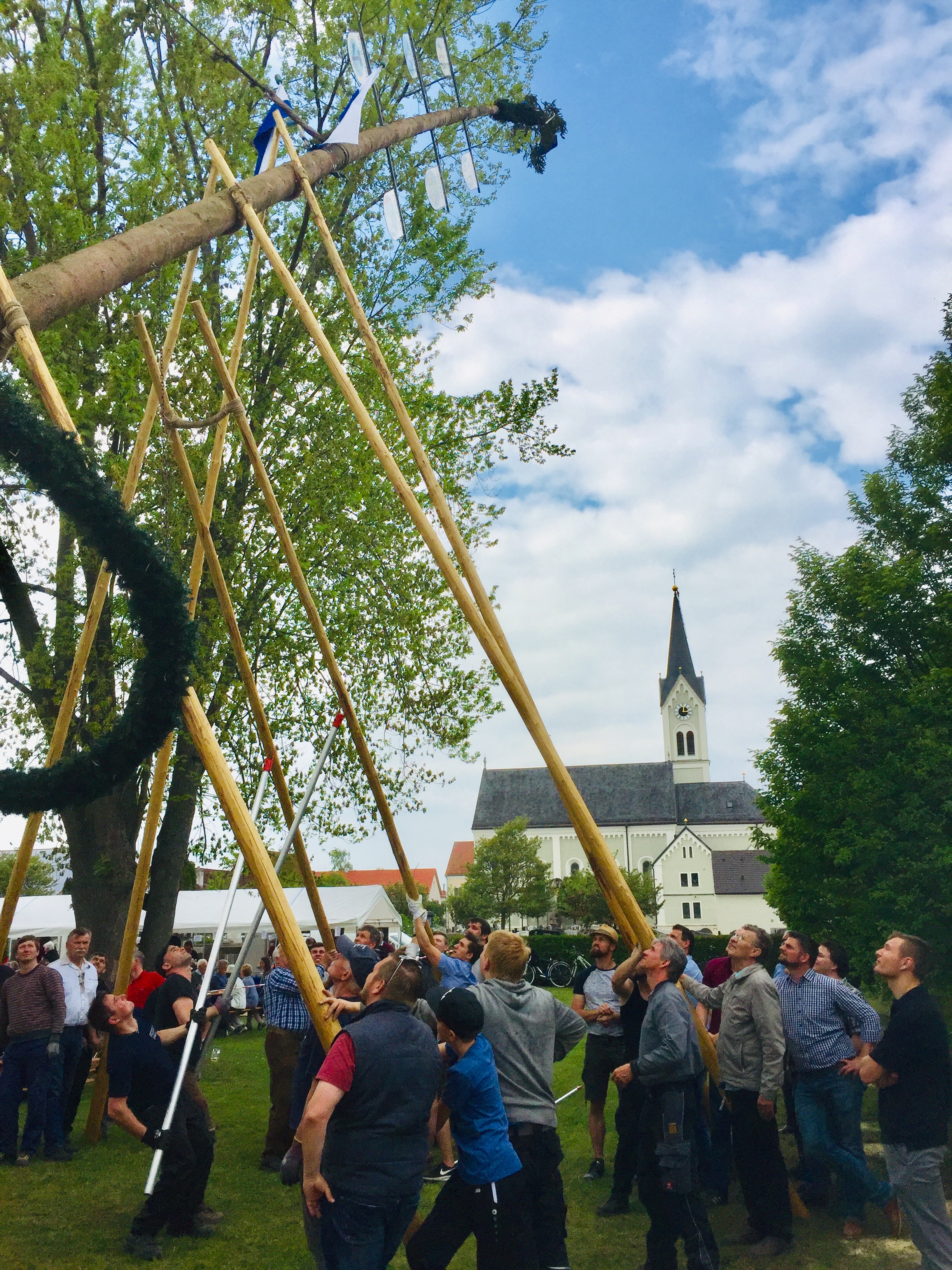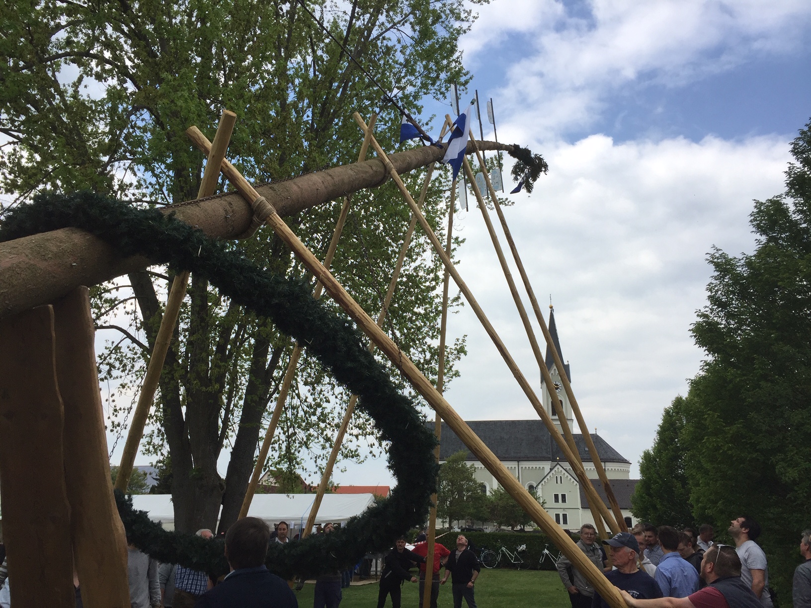 29 Meter lang ist der Maibaum, der heute von zahlreichen Helfern mit Muskelkraft in die Senkrechte gebracht wurde.