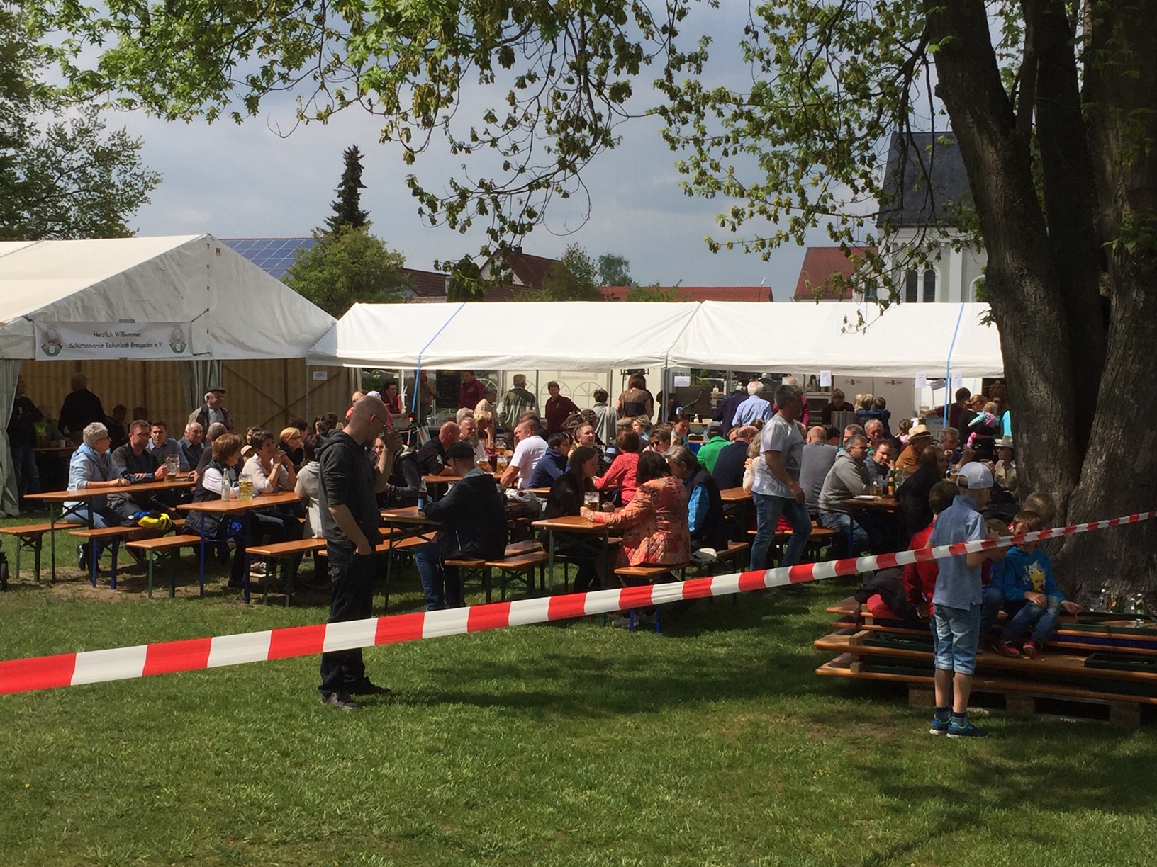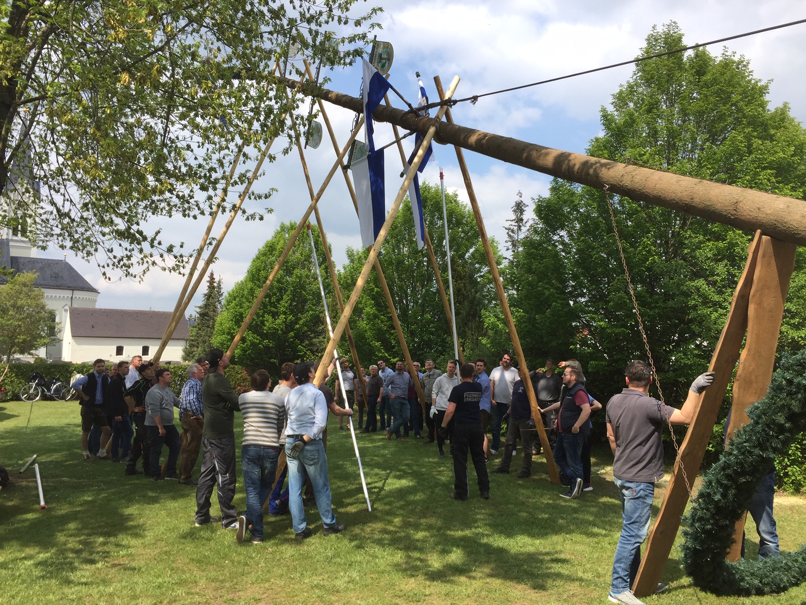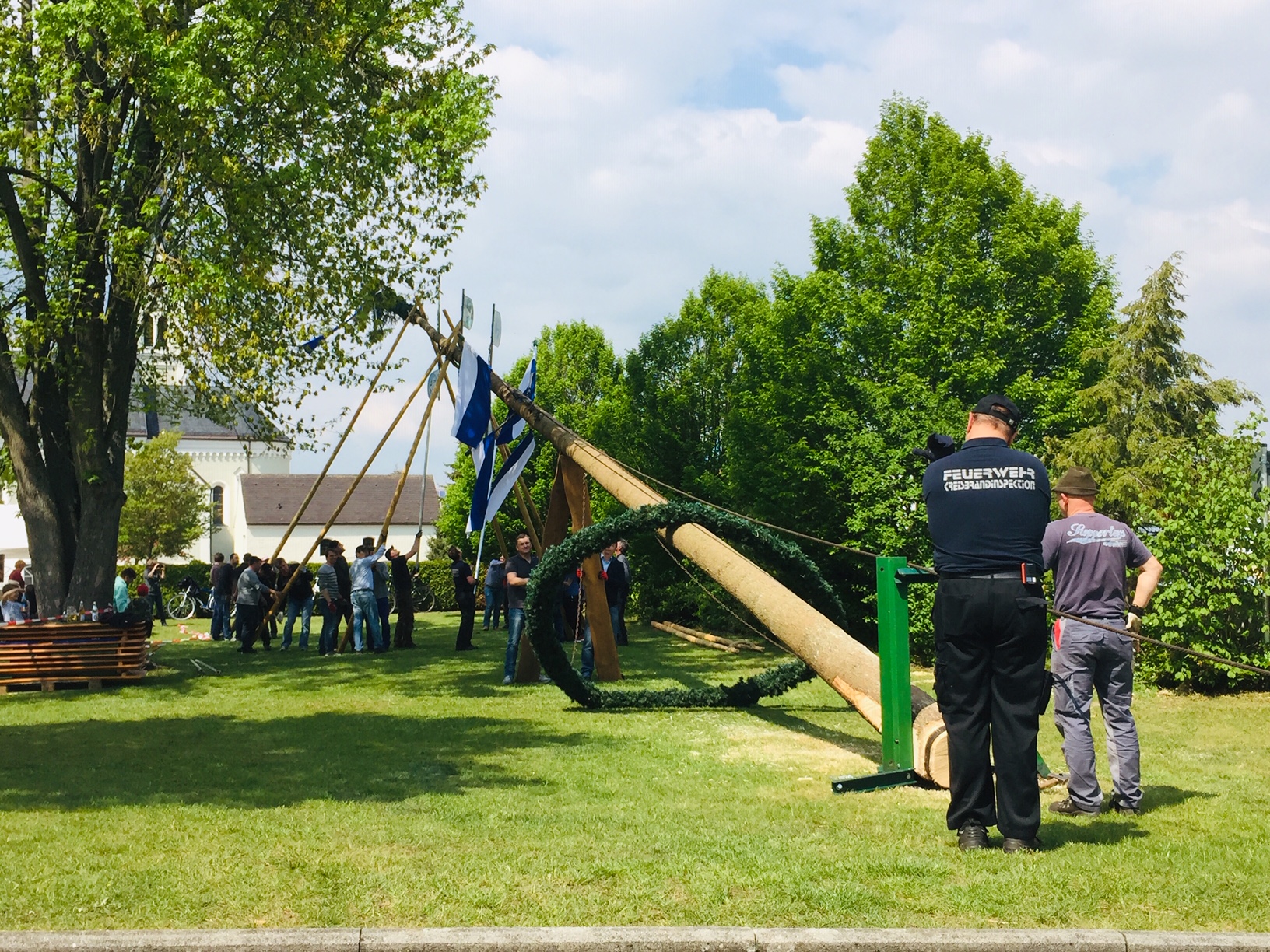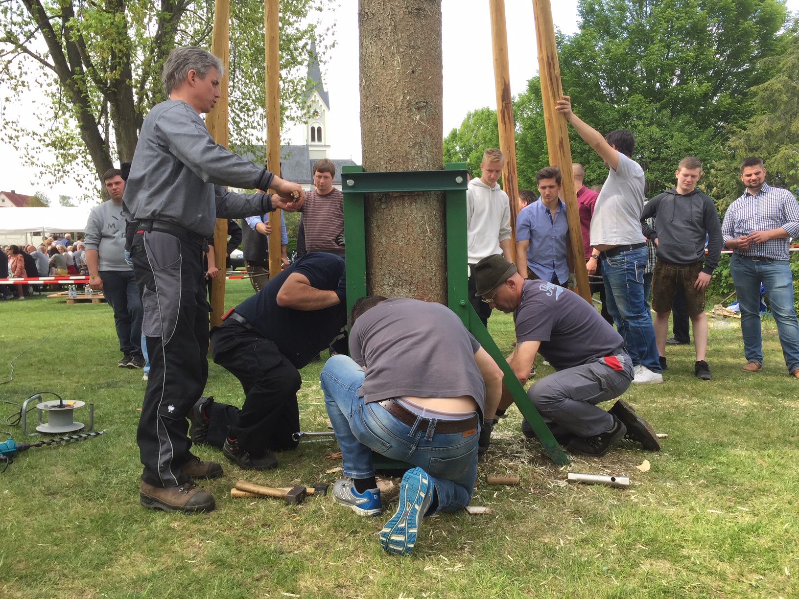 (ty) Der Schützenverein "Eichenlaub" und die hiesige Feuerwehr waren auch heuer wieder in Ernsgaden zur Stelle, um sich in der Traditions- und Brauchtumspflege zu engagieren. Zusammen mit weiteren freiwilligen Helfern stemmte man einen stolzen Maibaum von 29 Metern auf dem Platz bei der Schule in die Höhe. Bei bestem Frühlingswetter kamen viele Aktive, um den Stamm mit Muskelkraft – abgesichert durch ein langes, an einem Traktor befestigtes Seil – am frühen Nachmittag in die Senkrechte zu stellen.