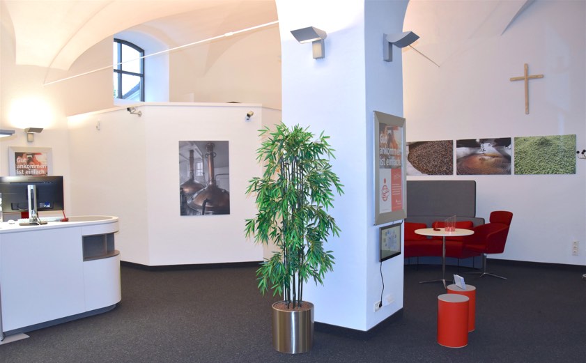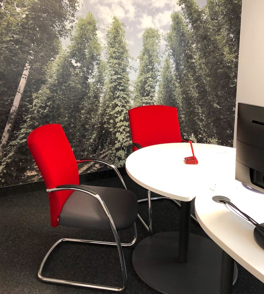 Die Geschäftsstelle Geisenfeld hatte schon immer ein besonderes Flair, allein durch die Gewölbedecken in dem ehemaligen Klosterbrauerei-Gebäude. Der historische Bezug und weitere heimatliche Motive, von Geisenfelder Ansichten bis Hopfen und Bier, werden auf den Wandbildern in den Büros in Szene gesetzt – im großen Format und mit viel Emotionalität. Die faszinierenden Bilder des örtlichen Fotografen Rudolf Zablowsky visualisieren die Heimatverbundenheit der Sparkasse ebenso wie ein weiteres raffiniertes Designelement: das Lichtband unterhalb der Decke im Eingangs- und SB-Bereich mit einer kleinen, sich wiederholenden Geisenfelder "Skyline".