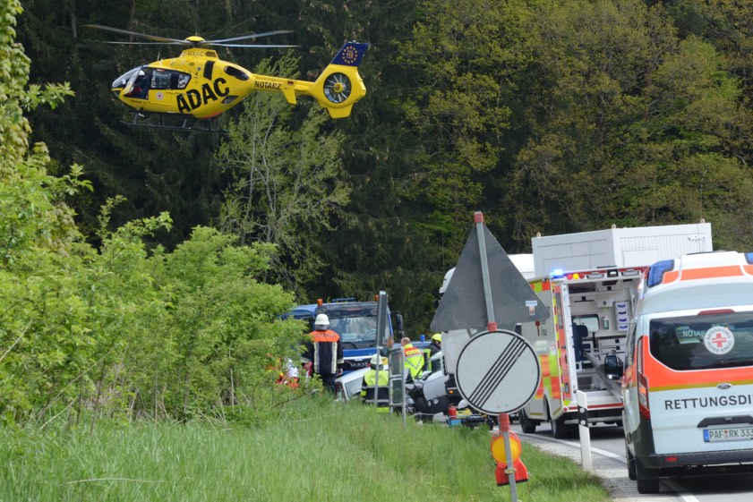 (zel) Ein schrecklicher Verkehrsunfall hat sich am heutigen Nachmittag auf der Kreisstraße PAF6 im Gemeinde-Gebiet von Hettenshausen ereignet. Ein mit vier Personen besetztes Auto, das in Richtung Hettenshausen unterwegs war, prallte frontal in ein Lastwagen-Gespann, das anscheinend beim Rechts-Abbiegen von der PAF26 auf die PAF6 zu weit ausgeholt hatte. Nach ersten Informationen wurden zwei der Pkw-Insassen schwer sowie die beiden weiteren mittelschwer verletzt. Ein Großaufgebot von Einsatzkräften war vor Ort.