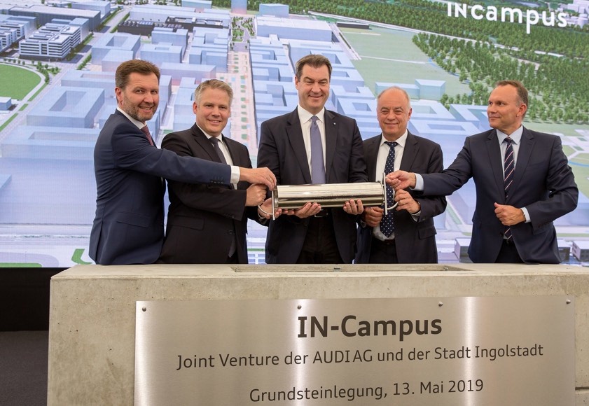 Oberbürgermeister Lösel bezeichnete das Projekt als "Sinnbild für den technologischen Wandel" in der Stadt: Einst Raffinerie, bald Innovations-Campus. "Wir bauen hier aber nicht nur neue Gebäude. Wir schaffen hier die Arbeitsplätze der Zukunft, für die Technologien der Zukunft." Dieser beispiellose Innovations-Campus sei "ein großartiges Bekenntnis von Audi zum Standort Ingolstadt". Der Grundstein sei daher ein wichtiges Symbol gleich in zweierlei Hinsicht: "Der Startschuss für den IN-Campus, zugleich der Grundstein für die weiterhin gute Entwicklung Ingolstadts."