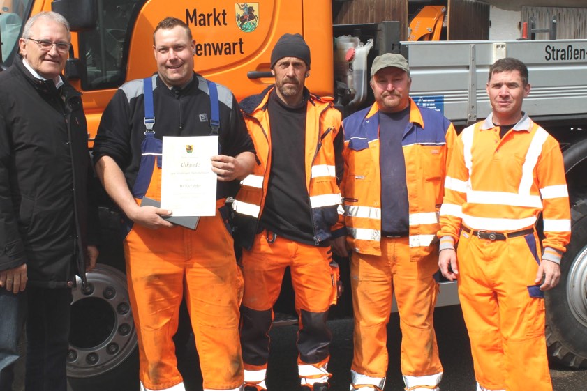 (ty) Seit dem 1. Mai 2009 steht Michael Jofer bereits in den Diensten der Gemeinde von Hohenwart. Als Klärhofwärter kümmert er sich unter anderem um die vier kommunalen Kläranlagen sowie um das gesamte System zur Abwasser-Beseitigung. Zudem unterstützt der in Wolshof wohnende Jofer häufig auch die Kollegen vom hiesigen Bauhof. Bürgermeister Manfred Russer (CSU) und Jofers Arbeitskollegen gratulierten ihm zum zehnjährigen Dienstjubiläum (Foto oben).