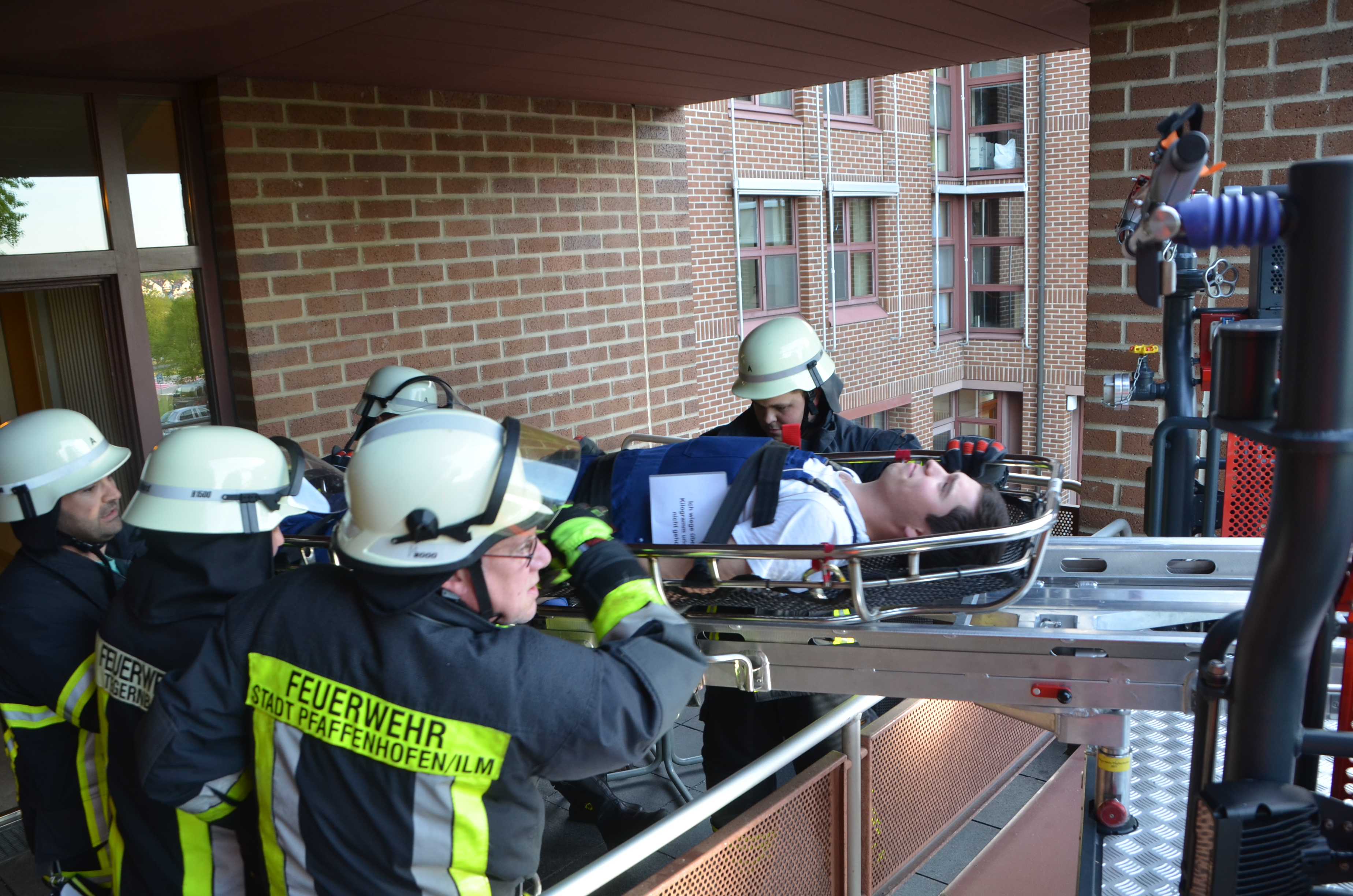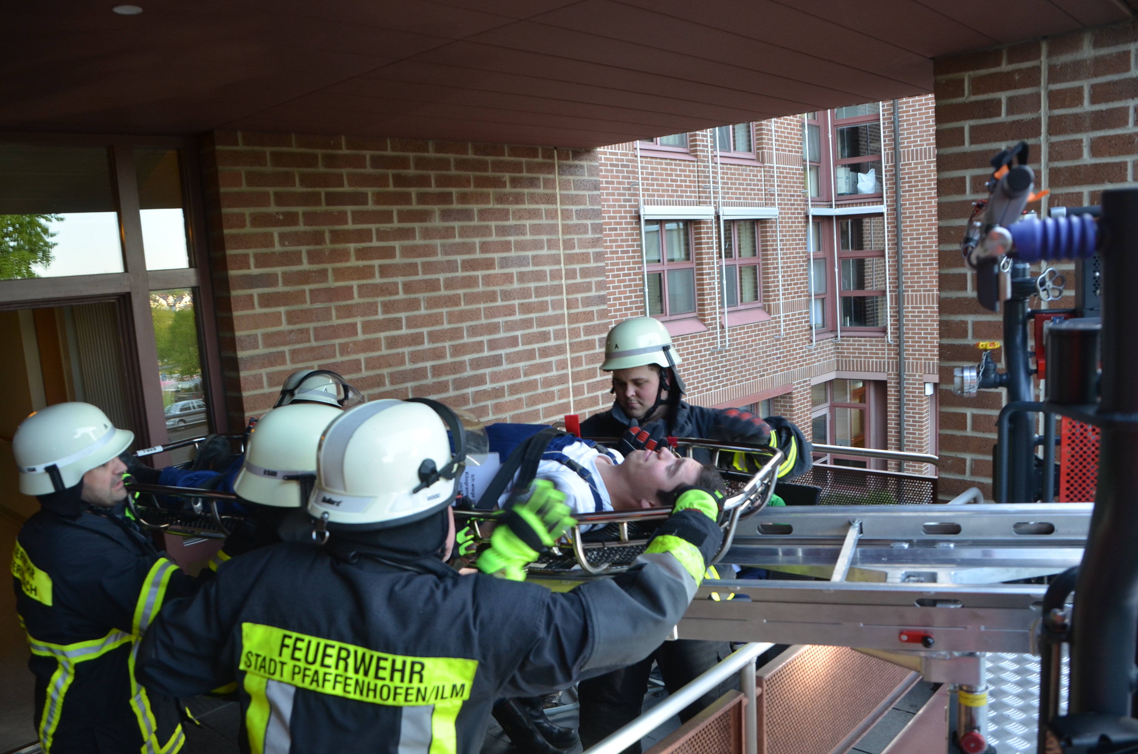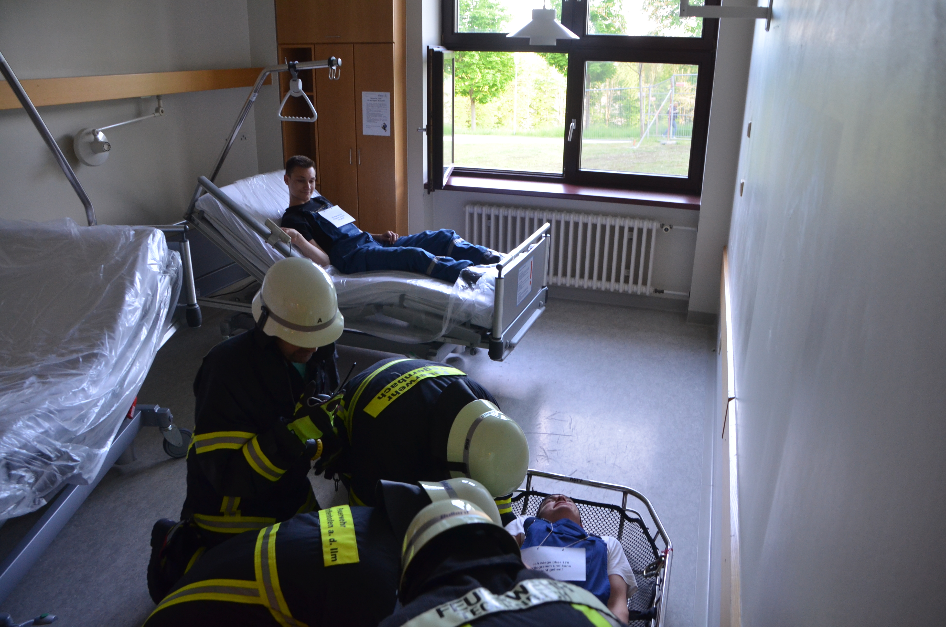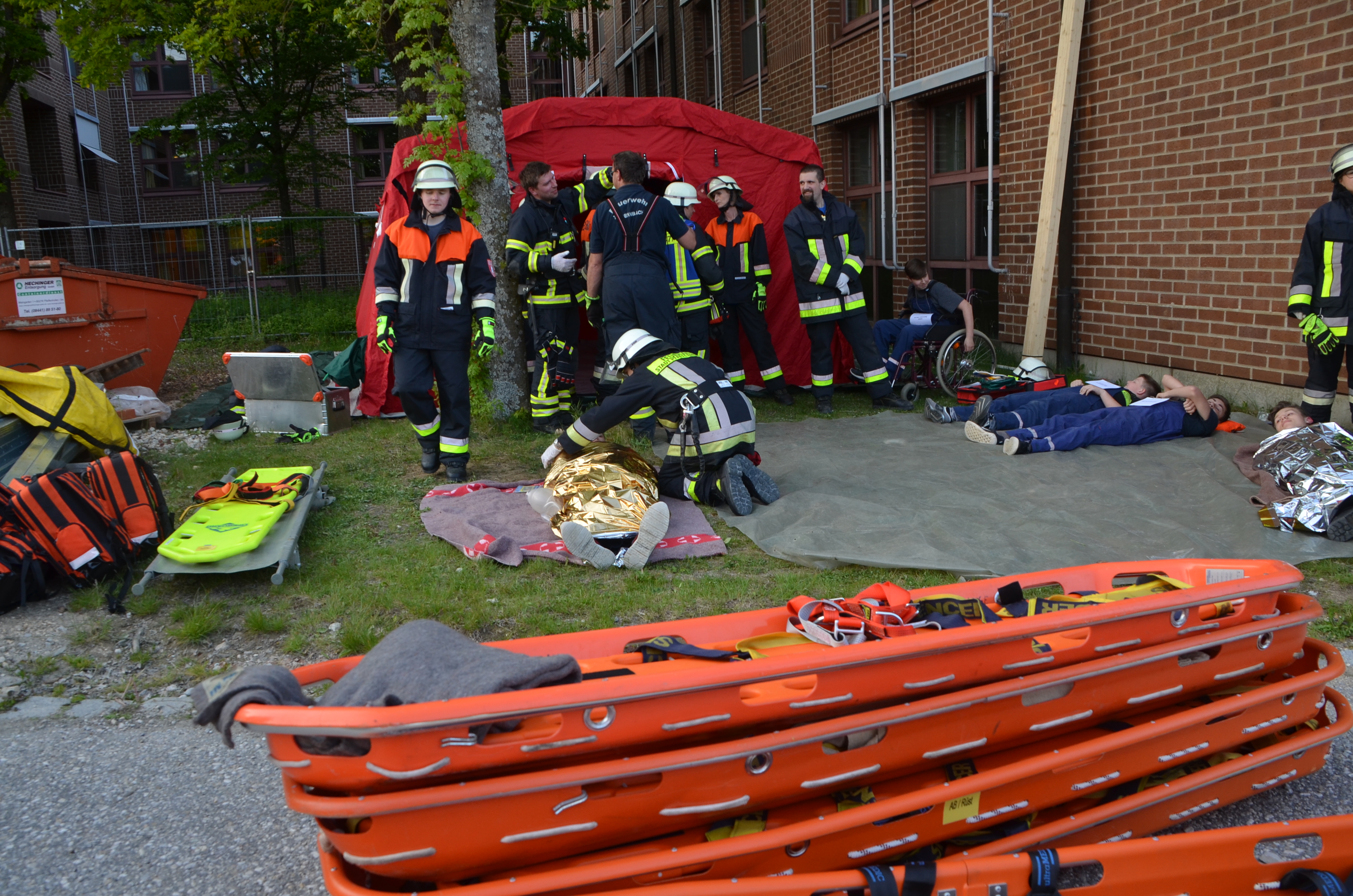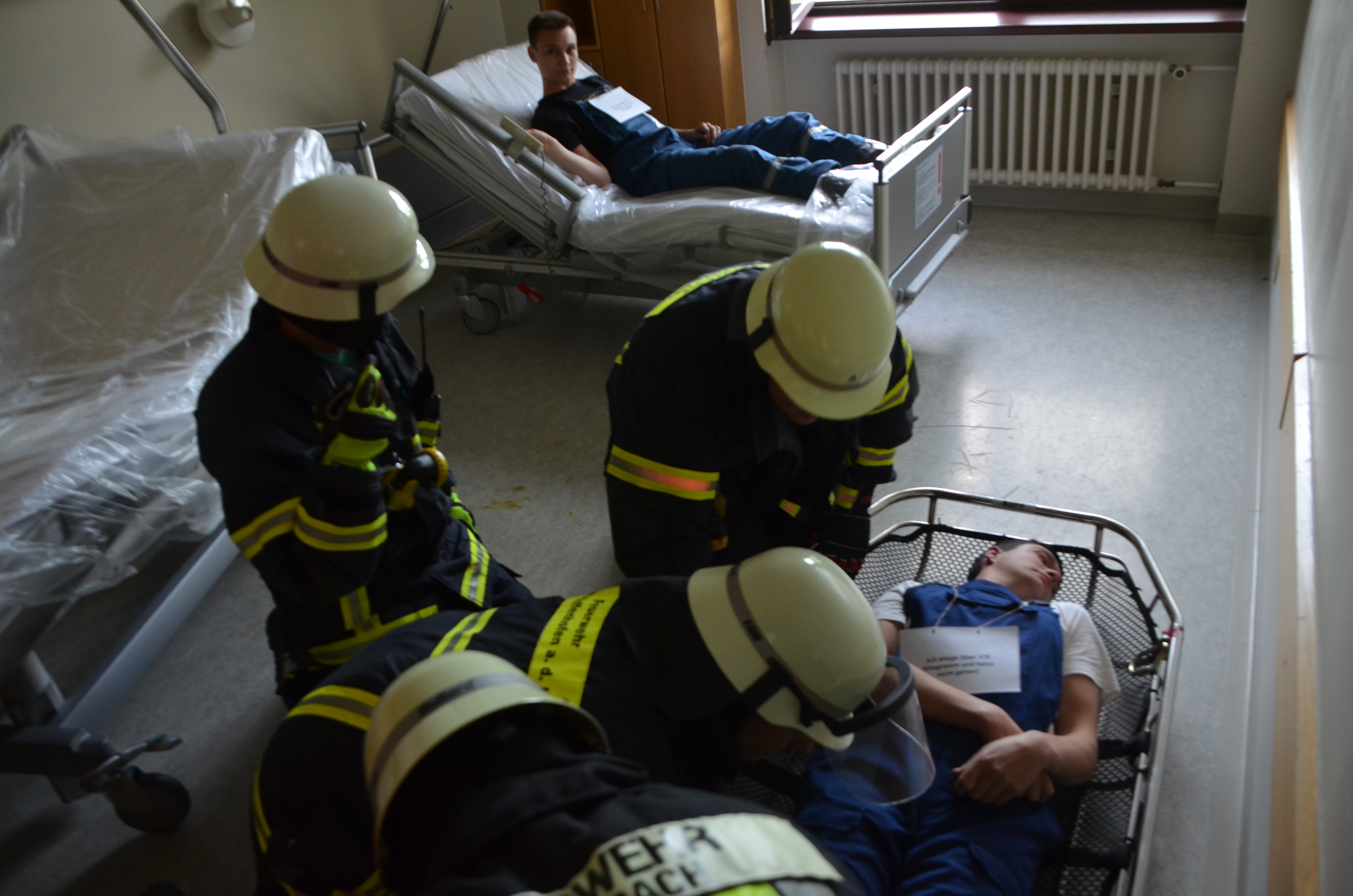 Die Retter mussten nach Lokalisierung des Brandmelde-Alarms im nachgestellten Rauchqualm zunächst versuchen, möglichst alle der 29 Opfer – dargestellt von Komparsen aus den Reihen der Jugend-Feuerwehr – zu finden. Danach galt es, sie aus den nicht wenigen Stations-Räumen möglichst unversehrt nach draußen zu bringen sowie die Erstversorgung zu übernehmen. Äußerst realistisch spielten dabei die jungen Floriansjünger die Verletzten. Eingebunden in das mit Rollstuhlfahrern oder bettlägrigen Personen anspruchsvolle Szenario waren übrigens auch sieben Azubis des Pfaffenhofener Krankenhauses.