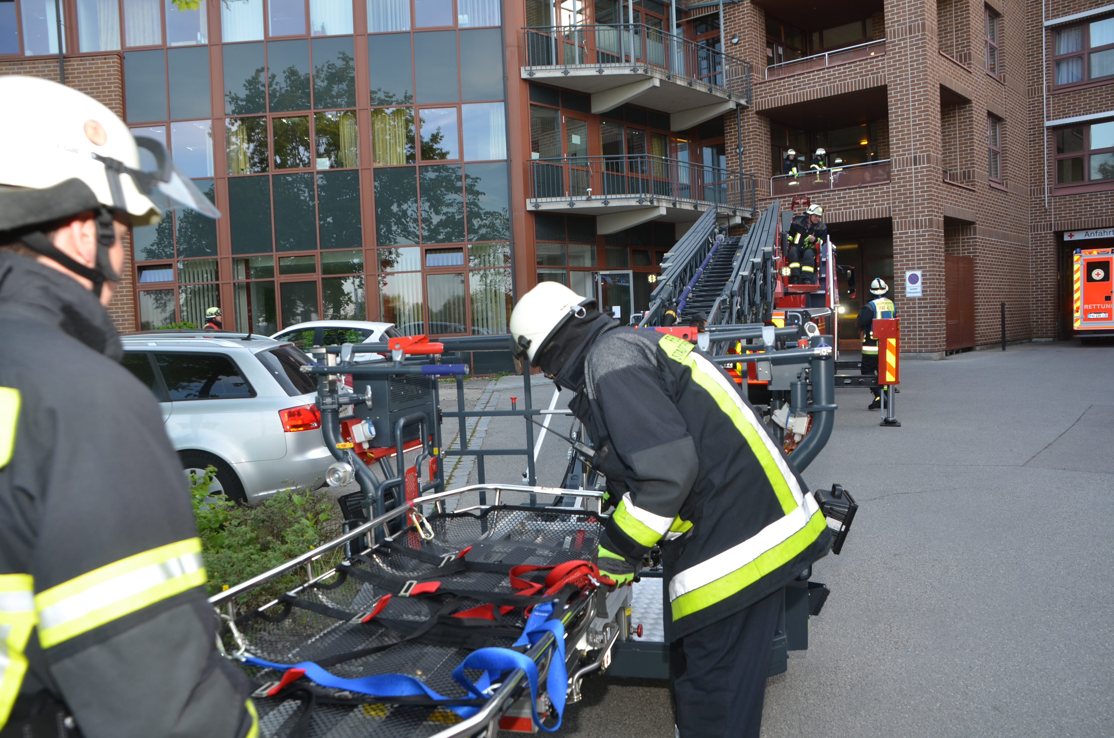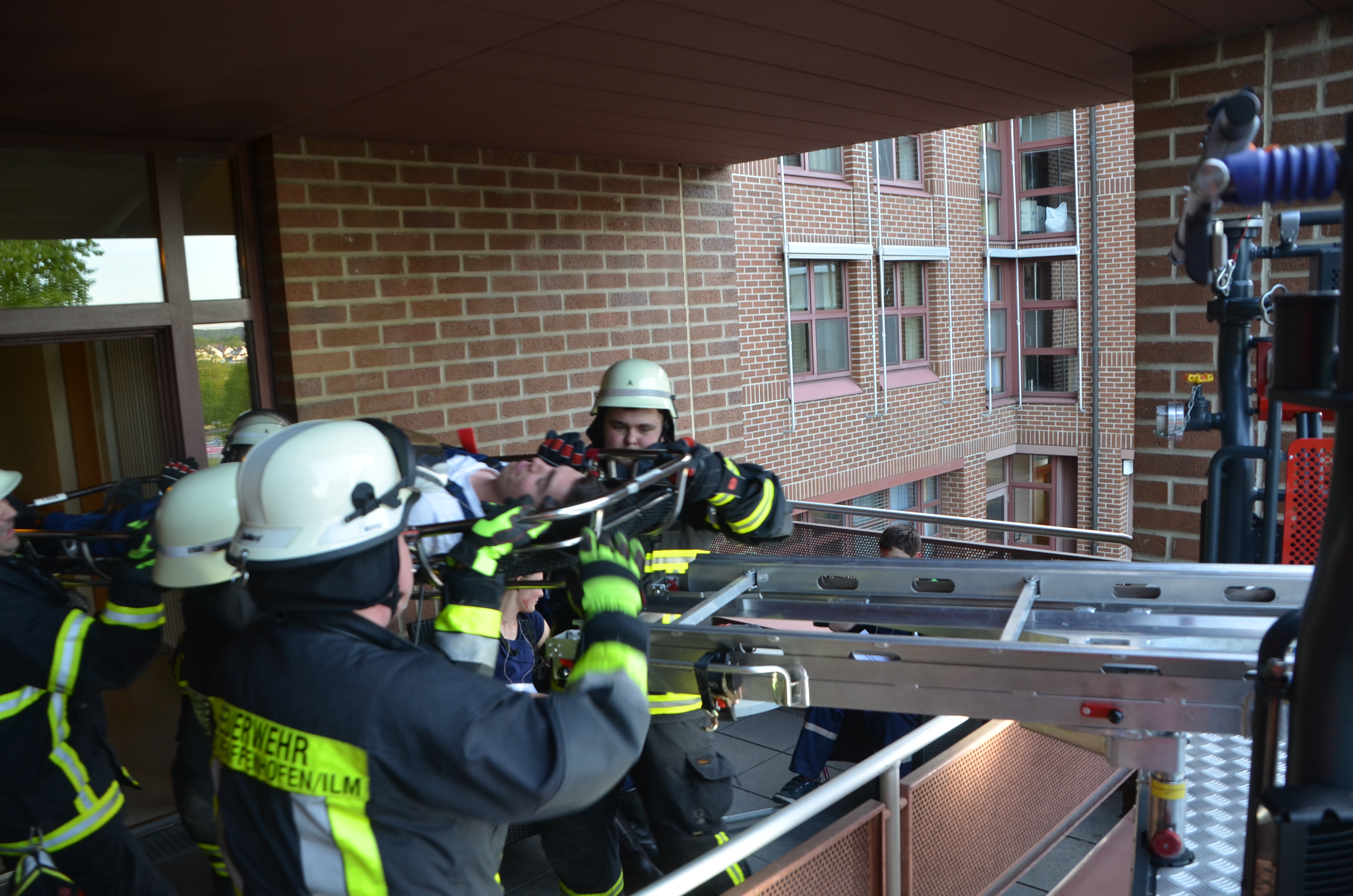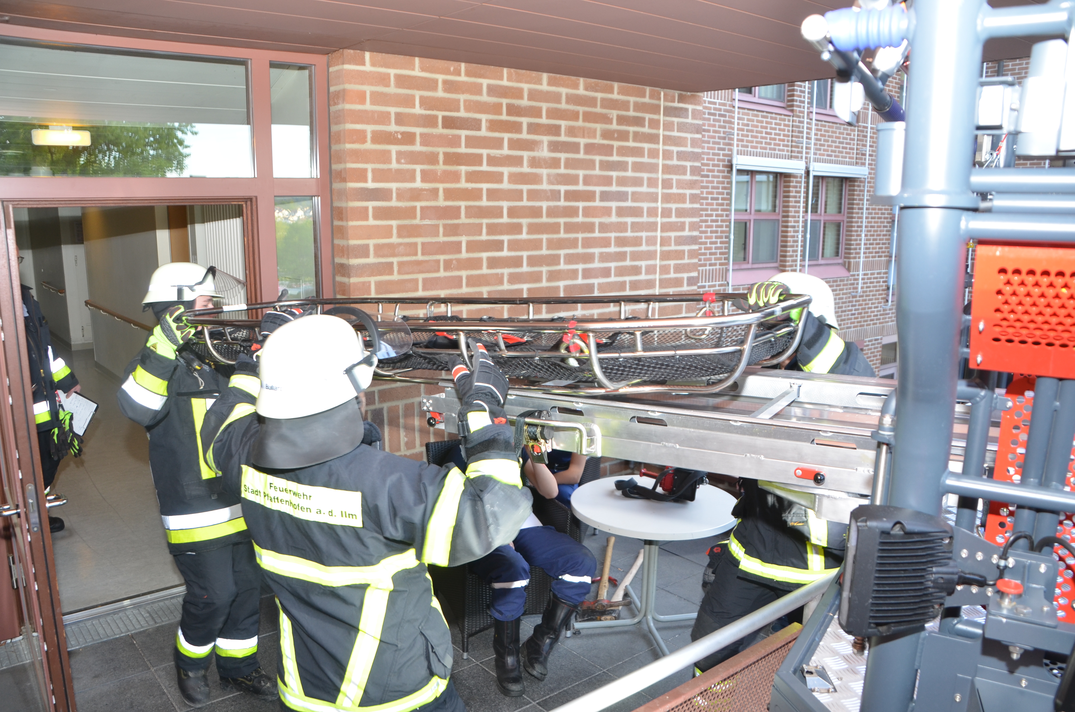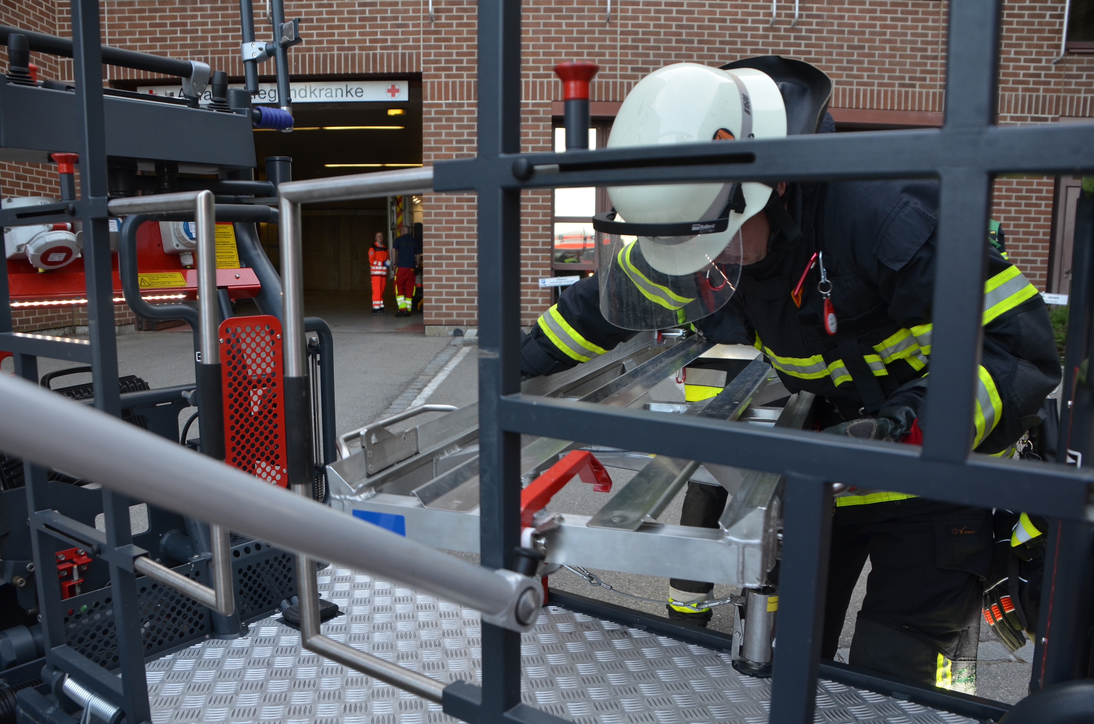 Mit Hilfe des Drehleiter-Rettungskorbs und eines darauf montierten Tragetischs wurden einige Patienten wie mit einem Bettenaufzug sicher aus dem ersten Stock des Gebäude-Trakts gerettet und zur Verletzten-Sammelstelle ins Freie gebracht. Interessant war, zu erfahren: Selbst bei einem Brand, wie er da gestern in der Ilmtalklinik nachgestellt wurde, kämen die Opfer zunächst ein Versorgungszelt, um sie danach gegebenenfalls in umliegende Kliniken zu bringen, wie Feuerwehr-Sprecher Florian Nischwitz erklärte. Während der so genannte Außen-Löschangriff bereits auf vollen Touren lief, erfolgte dann von drei Seiten aus der Innen-Löschangriff.