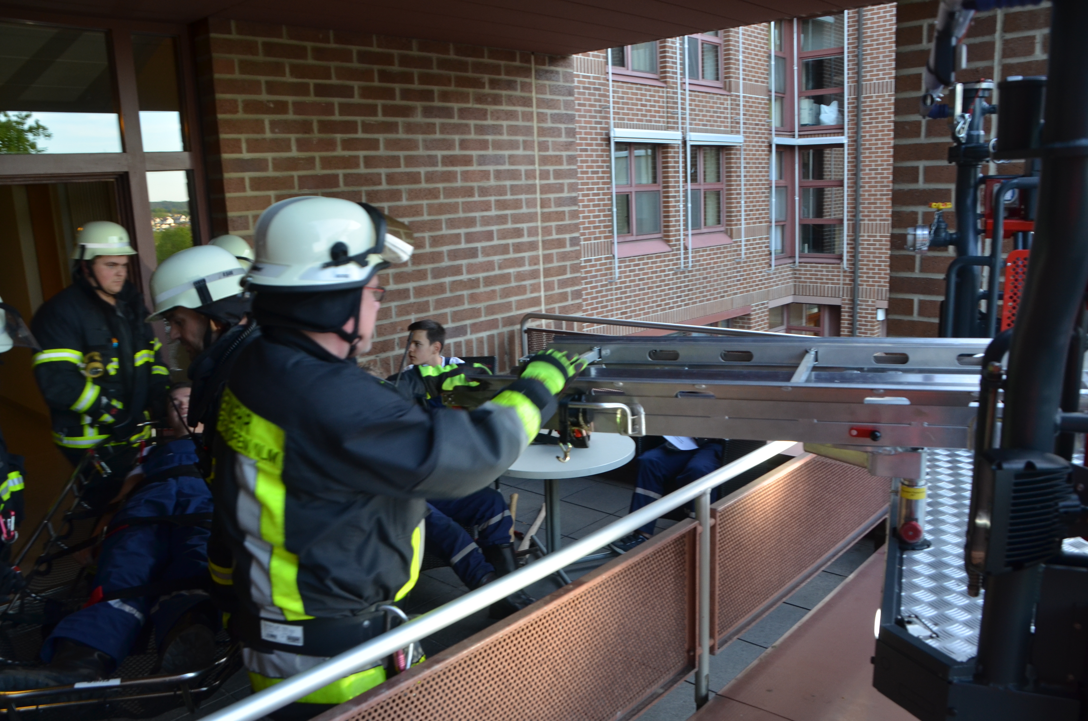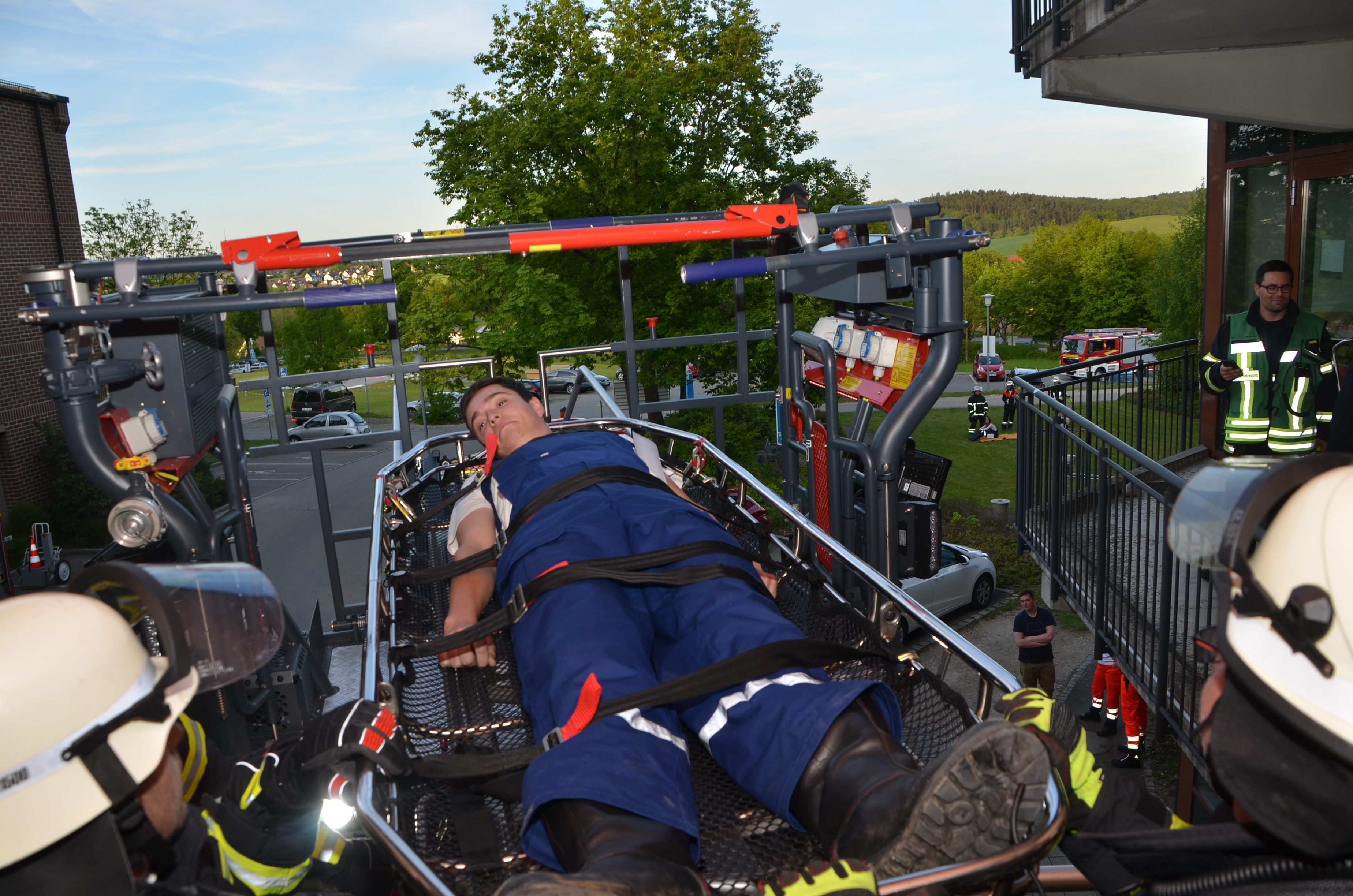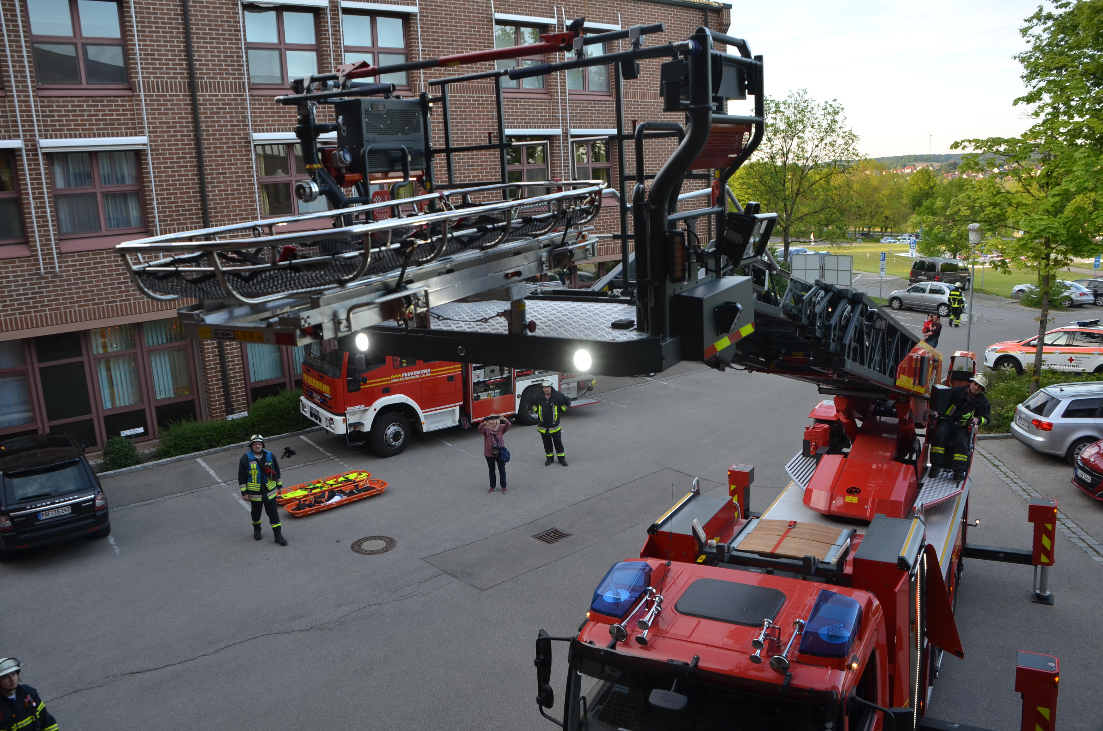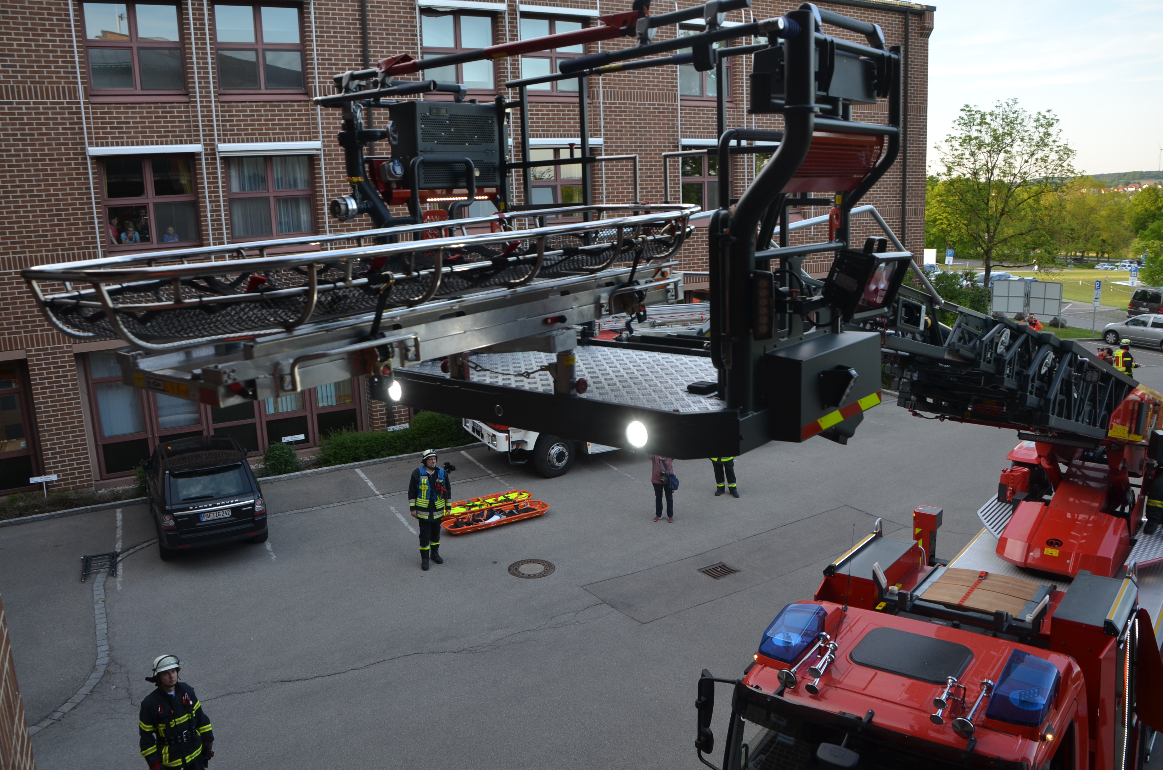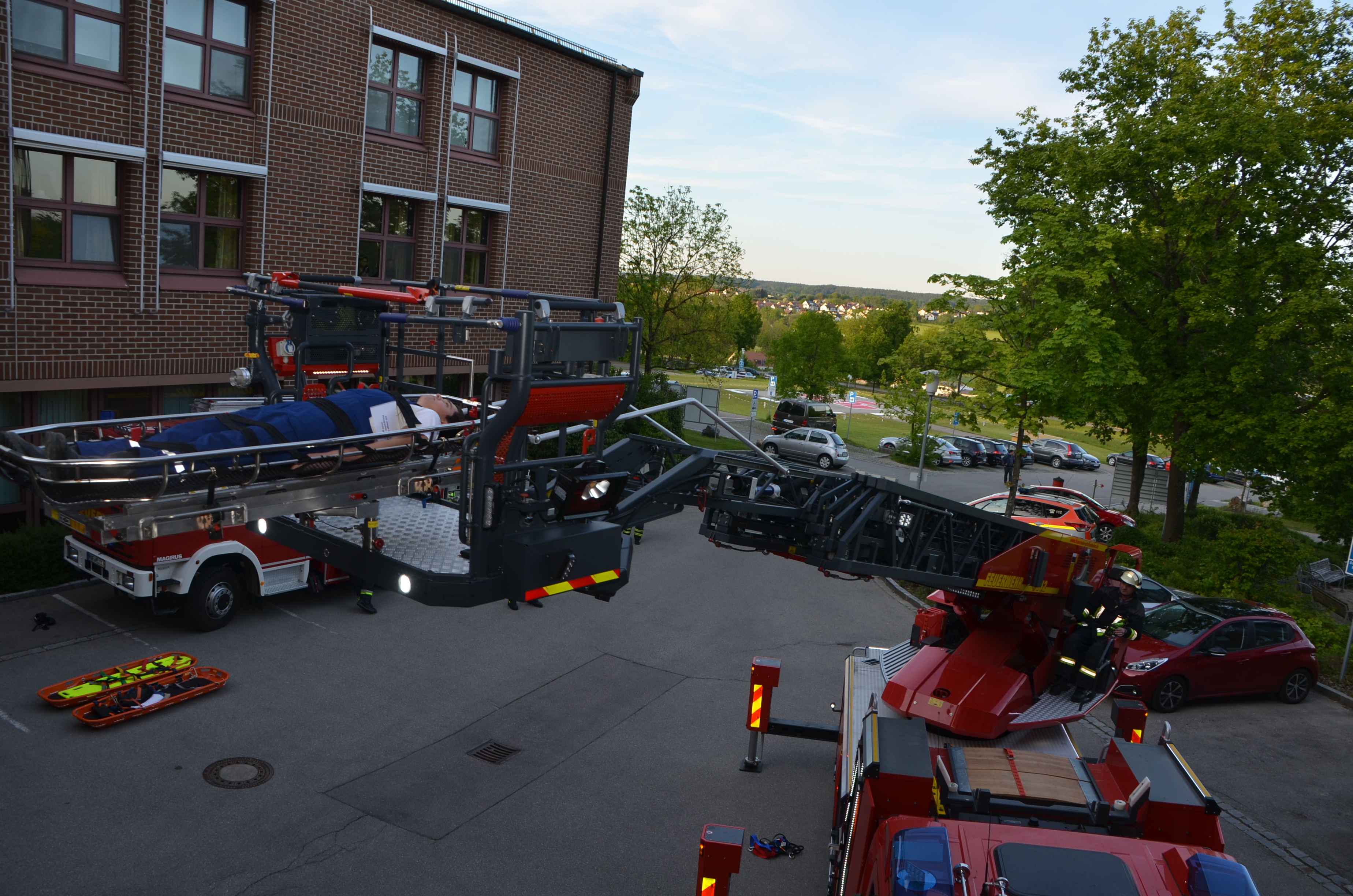 Mit Hilfe des Drehleiter-Rettungskorbs und eines darauf montierten Tragetischs wurden einige Patienten wie mit einem Bettenaufzug sicher aus dem ersten Stock des Gebäude-Trakts gerettet und zur Verletzten-Sammelstelle ins Freie gebracht. Interessant war, zu erfahren: Selbst bei einem Brand, wie er da gestern in der Ilmtalklinik nachgestellt wurde, kämen die Opfer zunächst ein Versorgungszelt, um sie danach gegebenenfalls in umliegende Kliniken zu bringen, wie Feuerwehr-Sprecher Florian Nischwitz erklärte. Während der so genannte Außen-Löschangriff bereits auf vollen Touren lief, erfolgte dann von drei Seiten aus der Innen-Löschangriff.
