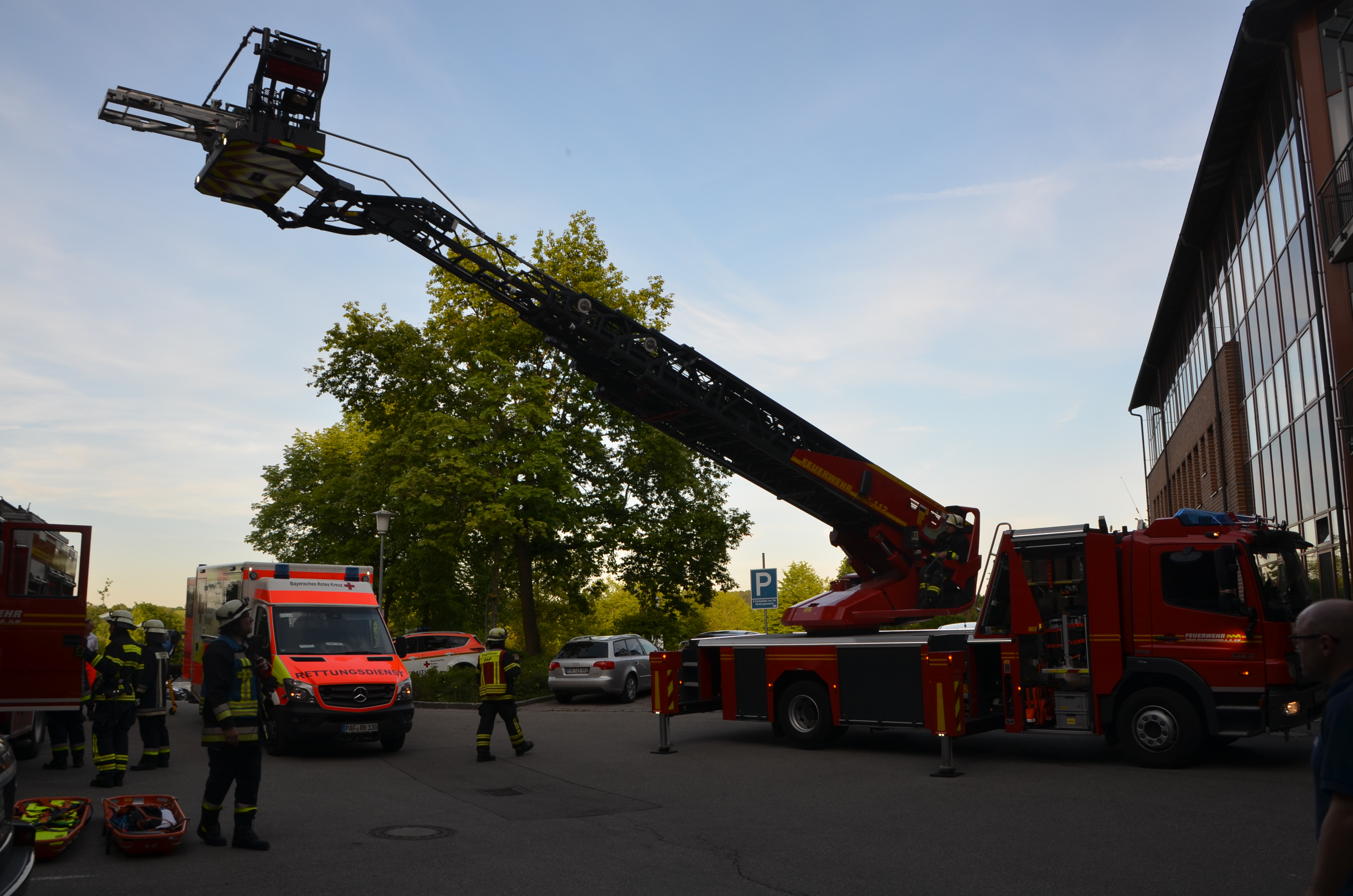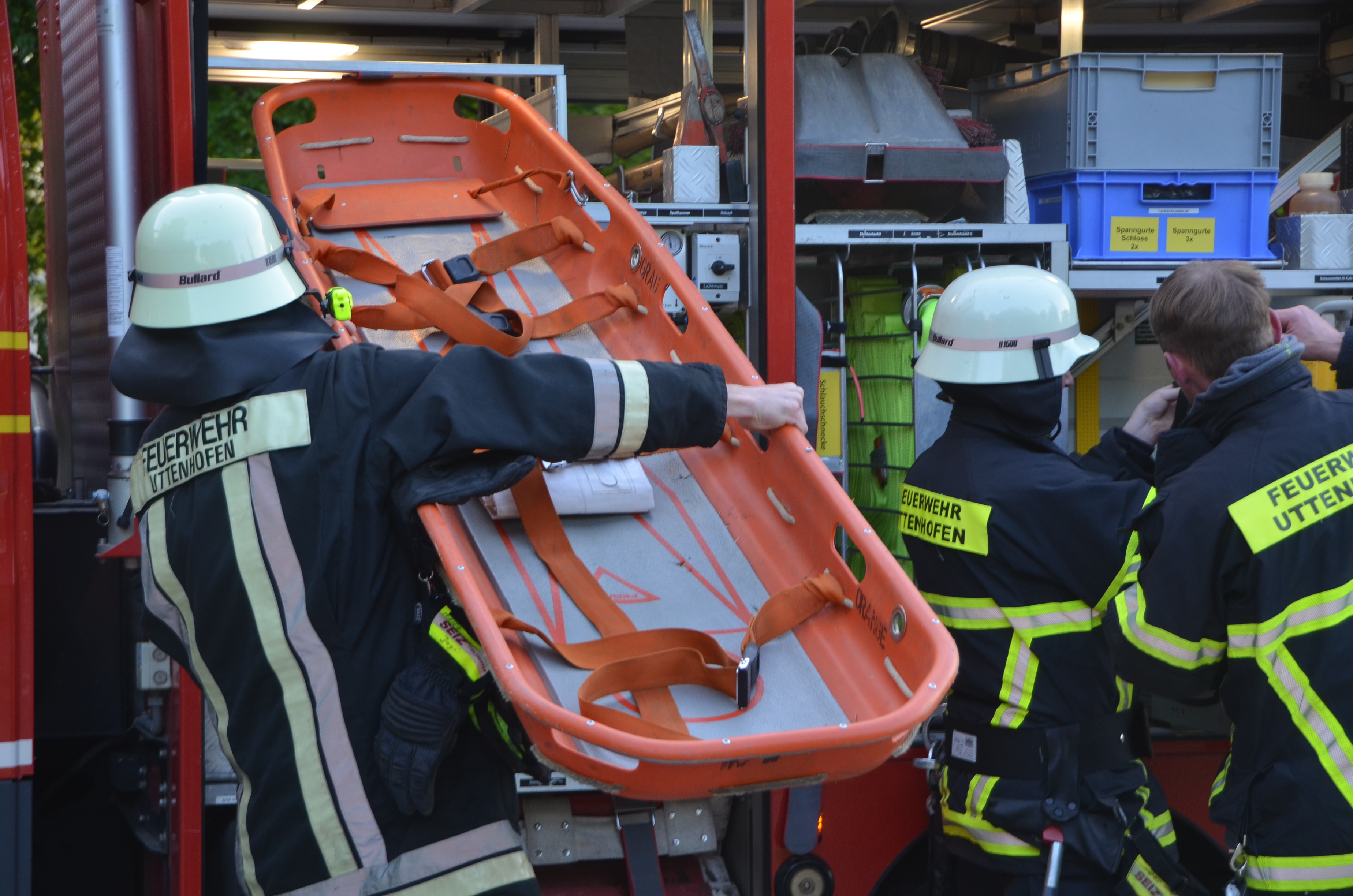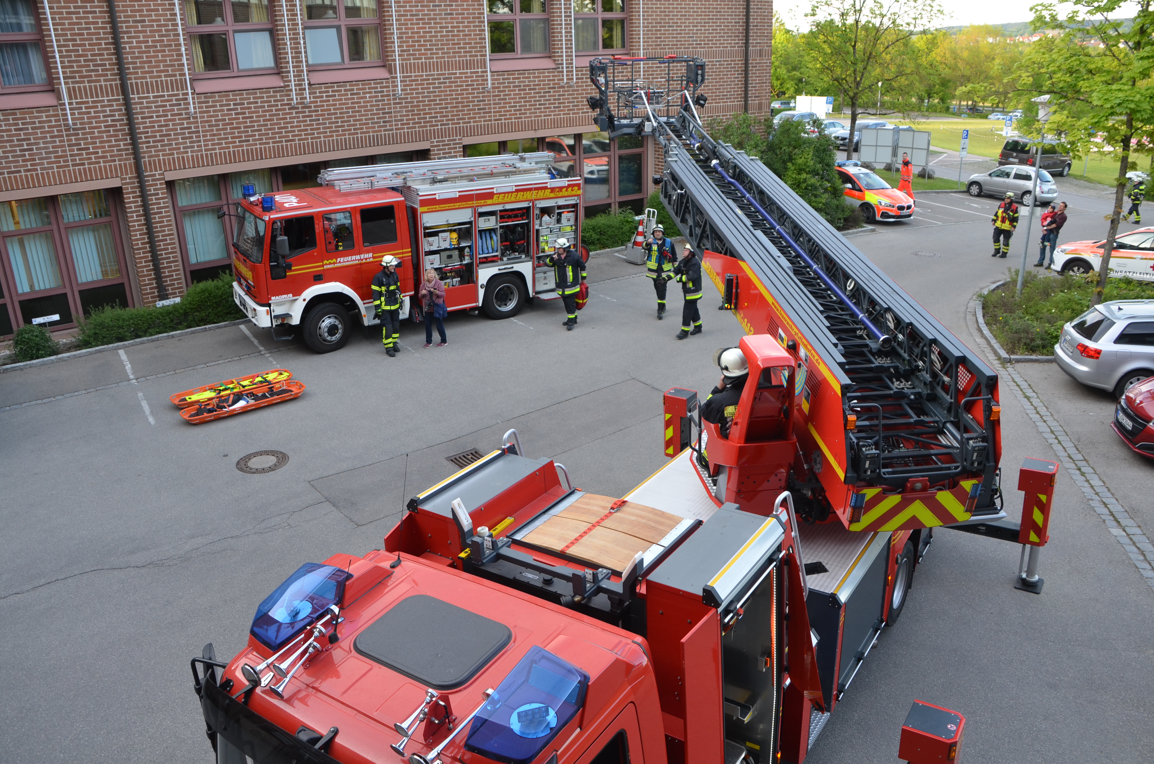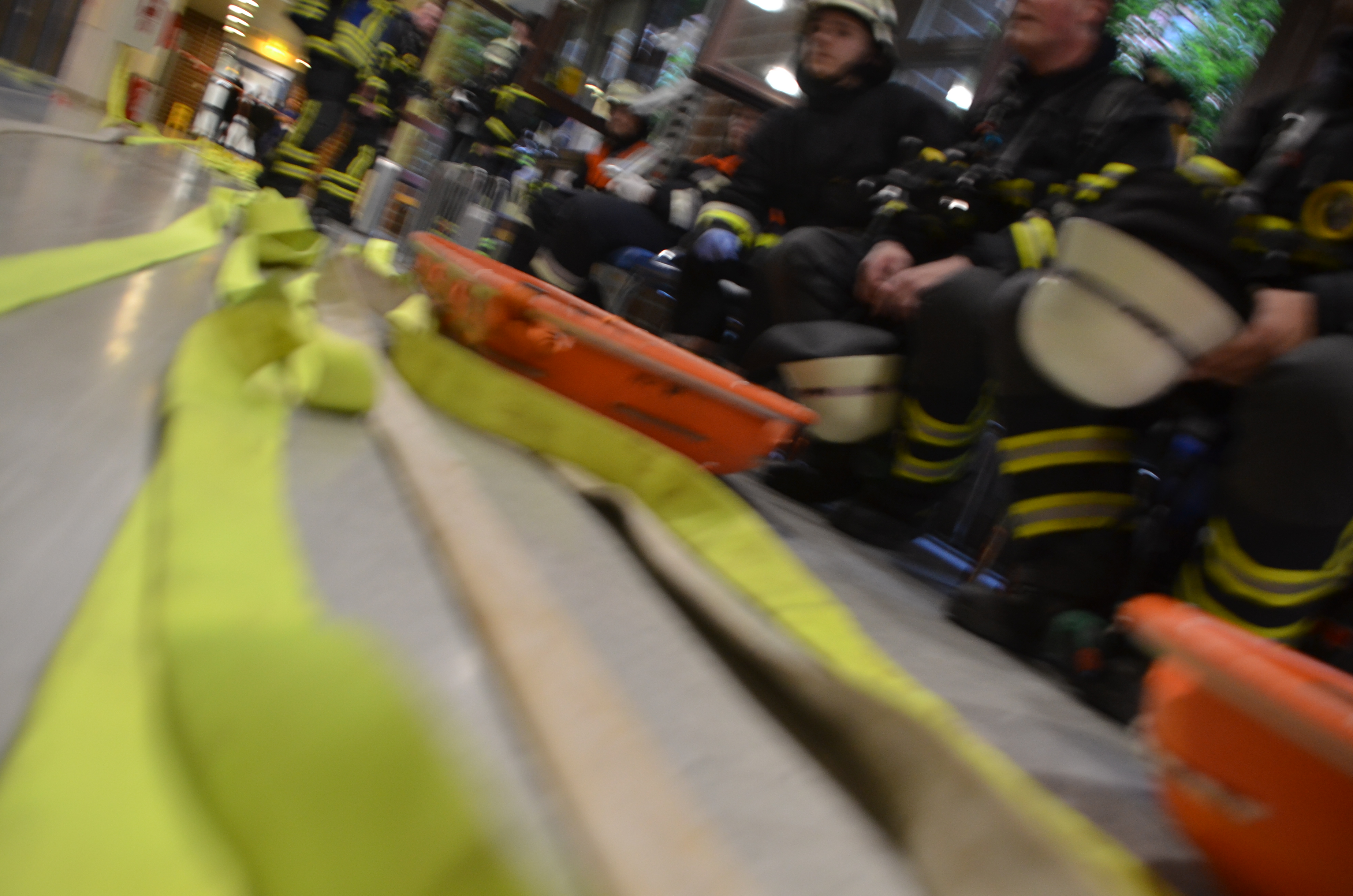 Mit Hilfe des Drehleiter-Rettungskorbs und eines darauf montierten Tragetischs wurden einige Patienten wie mit einem Bettenaufzug sicher aus dem ersten Stock des Gebäude-Trakts gerettet und zur Verletzten-Sammelstelle ins Freie gebracht. Interessant war, zu erfahren: Selbst bei einem Brand, wie er da gestern in der Ilmtalklinik nachgestellt wurde, kämen die Opfer zunächst ein Versorgungszelt, um sie danach gegebenenfalls in umliegende Kliniken zu bringen, wie Feuerwehr-Sprecher Florian Nischwitz erklärte. Während der so genannte Außen-Löschangriff bereits auf vollen Touren lief, erfolgte dann von drei Seiten aus der Innen-Löschangriff.
