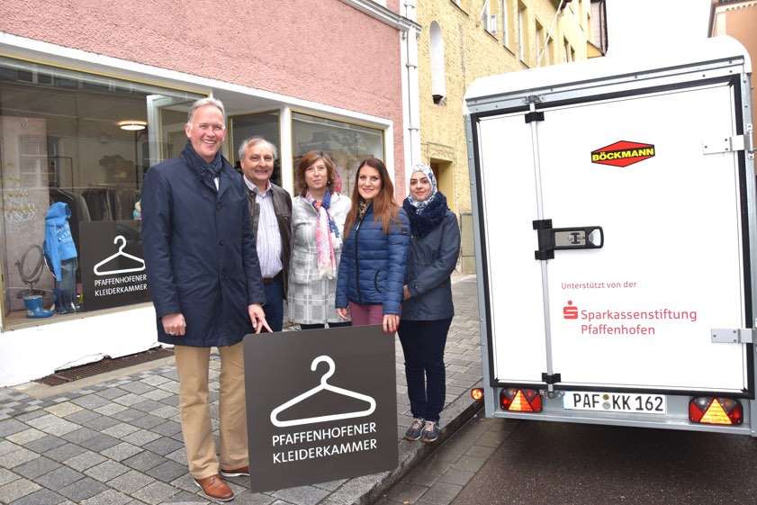 (ty) Mit insgesamt 3000 Euro hat die Sparkassen-Stiftung Pfaffenhofen die Arbeit der Kleiderkammer in der Kreisstadt gefördert. Mit dem Geld wurden das Projekt "RestCycling" und die Anschaffung eines Anhängers für den Kleidertransport unterstützt. Die Verantwortlichen der Kleiderkammer präsentierten jetzt den frisch beschrifteten Anhänger, auf dem die Unterstützung durch das Geldinstitut auch visualisiert ist.