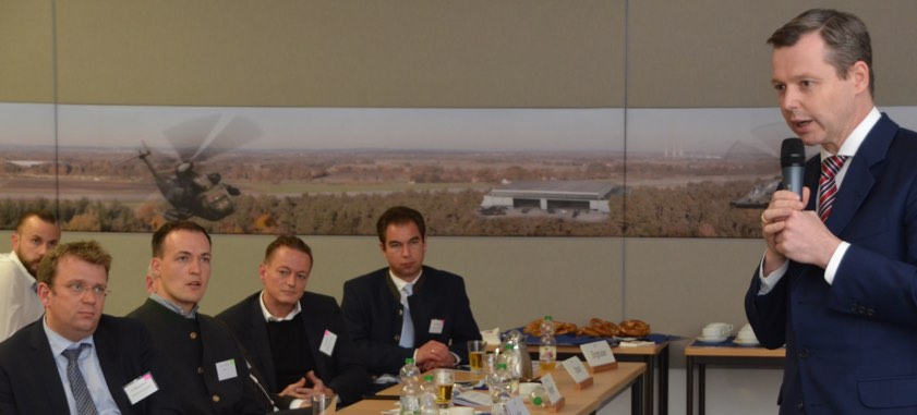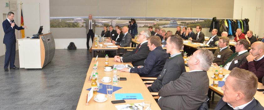 Staatssekretär Silberhorn bei seinen Ausführungen im Saal auf dem Manchinger Flughafen-Gelände.