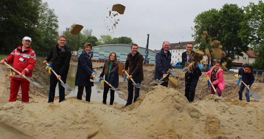 Danach warteten die mit Bändern in Stadtfarben geschmückten Spaten auf ihren Einsatz. Mit Schwung schleuderten der Wasserwacht-Vorsitzende Hans Postel und Stefan Satzger sowie CSU-Stadträtin Brigitte Axthammer (zuständige Referentin des Gremiums), Bürgermeister Thomas Herker, Vize-Landrat Anton Westner und Thomas Kalman sowie drei Schüler mit ihren Spaten die Erde in die Luft. Damit war der symbolische Akt vollbracht und das Signal gesendet: Nun geht es endlich los mit dem Hallenbad-Bau!