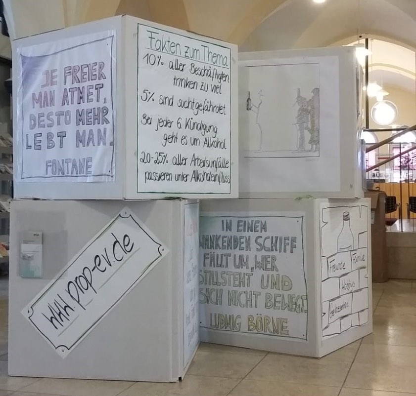 (ty) Auch heuer hat die psychosoziale Beratungsstelle des "Prop e.V." in Pfaffenhofen an der bundesweiten Aktionswoche zum Thema Alkohol teilgenommen, die von 18. bis 26. Mai stattfand und bereits zum siebten Mal organisiert wurde. Unter dem Motto "Kein Alkohol am Arbeitsplatz" erstellten die Mitarbeiter eine Wanderausstellung, die ab 20. Mai mehreren Unternehmen präsentiert wurde. "Durch das hohe Engagement eines Pfaffenhofener Betriebes wurde die Ausstellung sogar verlängert, sodass sie bis gestern sehen war", heißt es von dem Verein für Prävention, Jugendhilfe und Suchttherapie.