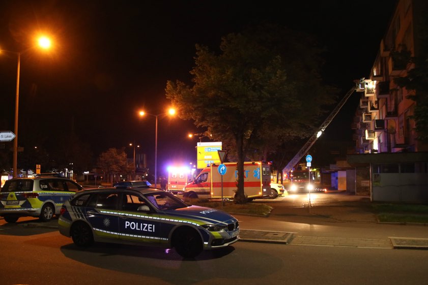 Noch am Tatort wurde ein 21-jähriger Tatverdächtiger – der Wohnungsinhaber – überwältigt und festgenommen. Er war dabei in einem hochgradig aggressiven Gemütszustand und wurde in einer Haftzelle ausgenüchtert. Hierbei kam es noch zu massiven Sachbeschädigungen durch den jungen Mann an der Zellen-Ausstattung. Der Tatverdächtige wird der zuständigen Ermittlungsrichterin vorgeführt, um die Haftfrage zu klären. Am Tatort wurde der Verletzte von der Feuerwehr mit Hilfe der Drehleiter aus dem vierten Stock gerettet (Foto oben). Er wurde dann zur stationären Behandlung in ein örtliches Krankenhaus gebracht.