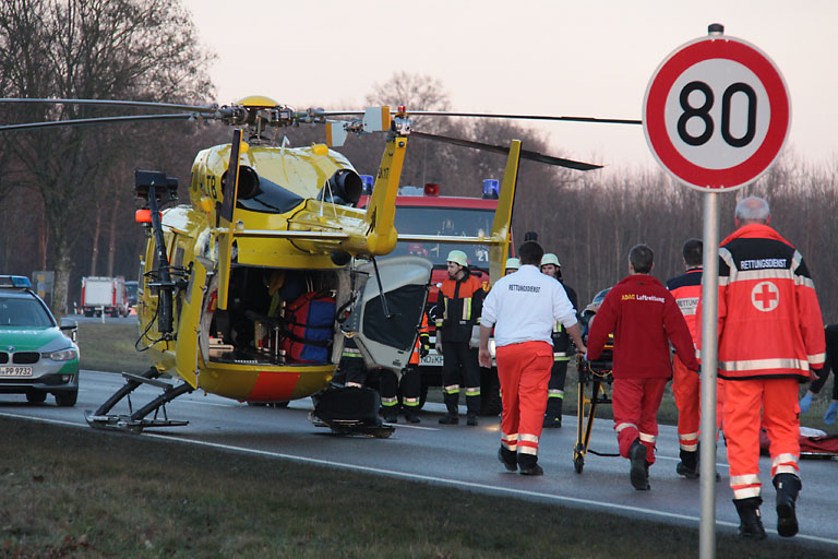 Alle vier Insassen wurden schwer verletzt. Beide Fahrer kamen mit Rettungshubschraubern in Kliniken in München und Ingolstadt. Die 70-jährige Frau und das Kleinkind wurden ins Krankenhaus Neuburg eingeliefert. Von beiden Fahrzeugführern wurden Blutproben genommen, ferner wurde durch die Staatsanwaltschaft die Erstellung eines unfallanalytischen Gutachtens angeordnet. Die B 16 war deswegen bis etwa 19.00 Uhr komplett gesperrt.