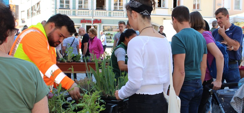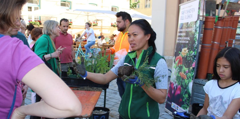 (ty) Die Gelegenheit, sich vom Profi eine Pflanzschale oder einen Blumenkasten bepflanzen zu lassen, nutzten am Samstagvormittag viele Pfaffenhofener: Beim Pflanz-Workshop im Rahmen der Begrünungs-Offensive "Pfaffenhofen soll blühen!" herrschte großer Andrang vor dem Rathaus. Gartenbau-Ingenieur Mario Dietrich und seine Kollegen von den Stadtwerken zeigten den Interessenten, wie man einen großen Trog oder auch einen kleinen Blumentopf bienenfreundlich bepflanzen kann.