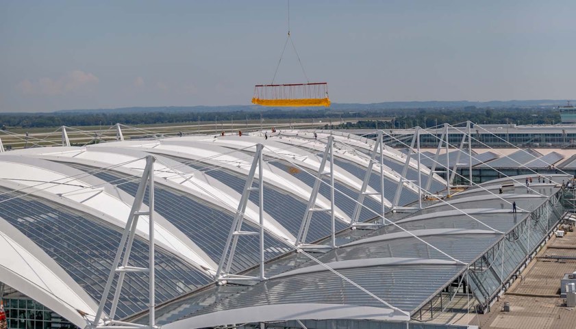 "Spezialisten einer Firma aus dem oberbayerischen Raubling werden in den kommenden Wochen den aufwändigen Einbau der Membranfelder durchführen", so die Airport-GmbH. Während der Dacharbeiten müsse aus Sicherheitsgründen die Wegeführung für Fluggäste und Mitarbeiter im MAC geändert werden. Die Sanierungsarbeiten werden den Angaben zufolge voraussichtlich bis Ende Juli abgeschlossen sein. (Fotos: FMG / Michael Fritz, Alex Tino Friedel)