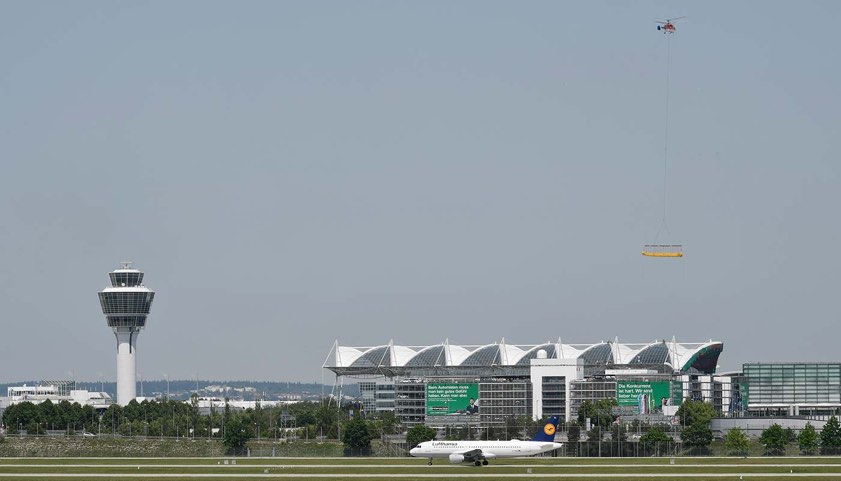 (ty) Spektakuläre Sanierung in 45 Meter Höhe: Mit Hilfe eines Lasten-Hubschraubers wurden heute zwei neue teflon-beschichtete Membran-Felder auf dem Glasdach des München-Airport-Centers (MAC) eingespannt. Die rautenförmigen Dachflächen haben nach Angaben der Flughafen-Gesellschaft (FMG) eine Gesamtfläche von jeweils 1100 Quadratmetern und wiegen rund zwei Tonnen.
