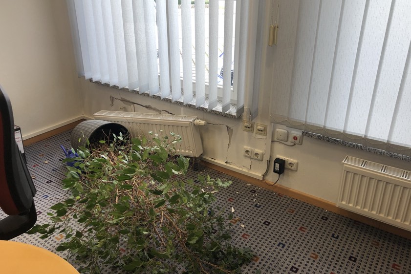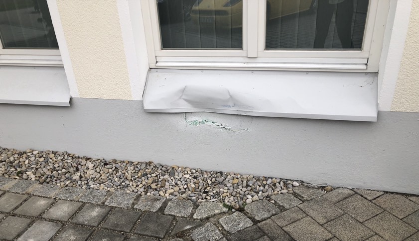 (ty/zel) Von außen betrachtet sieht es gar nicht so schlimm aus: eine kleine Bruchstelle in der Mauer, ein verbogenes Metall-Fensterbrett. Doch der Blick ins Innere des Gebäudes zeigt, dass es doch ganz schön gescheppert haben muss. Der Aufprall war demnach zumindest so heftig, dass durch die Folgen ein Heizkörper aus der Verankerung gerissen wurde und teilweise von der Wand fiel. Augenscheinlich riss er auch noch einen größeren Pflanz-Kübel mit. Der Schaden geht in die Tausende.