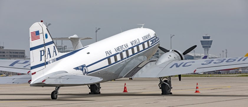 (ty) Aufsehen erregendes Gastspiel für Luftfahrt-Kenner am Münchner Airport: Eine "Douglas DC-3" in der historischen Bemalung der amerikanischen Fluggesellschaft "Pan Am" konnten Passagiere und Mitarbeiter des Flughafens auf dem Vorfeld bestaunen. Dieses Flugzeug, das in der vergangenen Woche an den Gedenk-Veranstaltungen anlässlich des 75. Jahrestages der Landung in der Normandie zum Einsatz gekommen war, gehört zu den weltweit heute noch rund 150 flugtauglichen Exemplaren dieses Typs. Mit über 16 000 produzierten Maschinen ist die DC-3 bis heute das meist gebaute Verkehrs-Flugzeug der Luftfahrt-Geschichte.