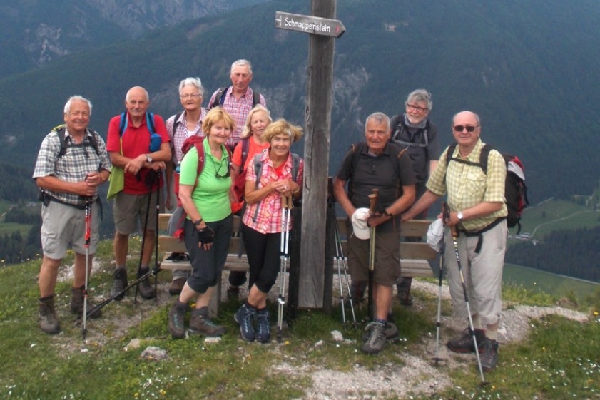 (ty) Zu einer weiteren geführten Bergtour hatte die DAV-Sektion Pfaffenhofen-Asch kürzlich eingeladen. Von Schwendt am Fuße des Wilden Kaisers führte die Tour zunächst über Ochswies und die Untere Schnappen-Alm hinauf zum Schnappenkreuz. Weiter ging es zum höchsten Gipfel, dem Schnappen mit 1546 Metern, ehe die Gruppe (Foto oben) das Ziel der Tour, den Schnappenstein mit der Schnappenstein-Kapelle, erreicht hatten. Von hier genossen die Bergwanderer einen herrlichen Ausblick auf den Walchsee und zum Wilden Kaiser. "Optimales Wanderwetter, leicht bewölkt mit einer Brise Wind, das Zirpen der Grillen und die Vielfalt der Wildblumen waren die Wegbegleiter dieser wunderbaren Tour, organisiert von Wanderleiter Jakob Kraft", fasst der DAV zusammen.
