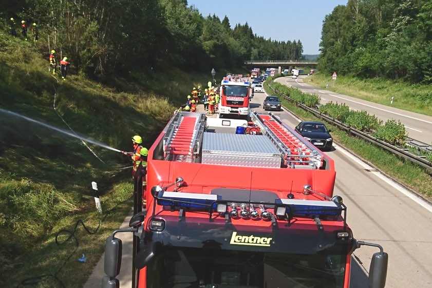 "Mit mehreren C-Rohren konnte der Brand schnell unter Kontrolle gebracht werden", heißt es von den Einsatzkräften. Durch das schnelle Eingreifen der Feuerwehren konnte zum Glück auch ein Übergreifen der Flammen auf den angrenzenden Wald verhindert werden. Die Autobahn war in Fahrtrichtung München zwischen etwa 16 Uhr und 17.30 Uhr nur einspurig befahrbar. Neben den Floriansjüngern aus Langquaid waren auch die Kameraden aus Bad Abbach und Teugn im Einsatz.