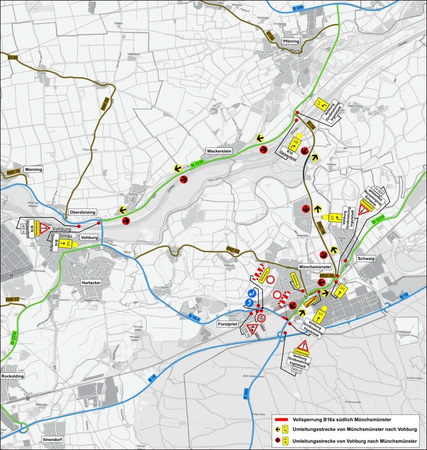 (ty) Voraussichtlich ab diesem Donnerstag, 4. Juli, erneuert das Staatliche Bauamt Ingolstadt unter zweitägiger Vollsperrung die Fahrbahn der B16a im Einmündungs-Bereich der Bundesstraße 16a in die Staatsstraße 2233 bei Münchsmünster. Die Umleitungen (siehe auch Karte unten) werden örtlich beschildert, teilte die Behörde mit. Die Bauarbeiten sollen den Angaben zufolge bereits am Freitag, 5. Juli, abgeschlossen sein.