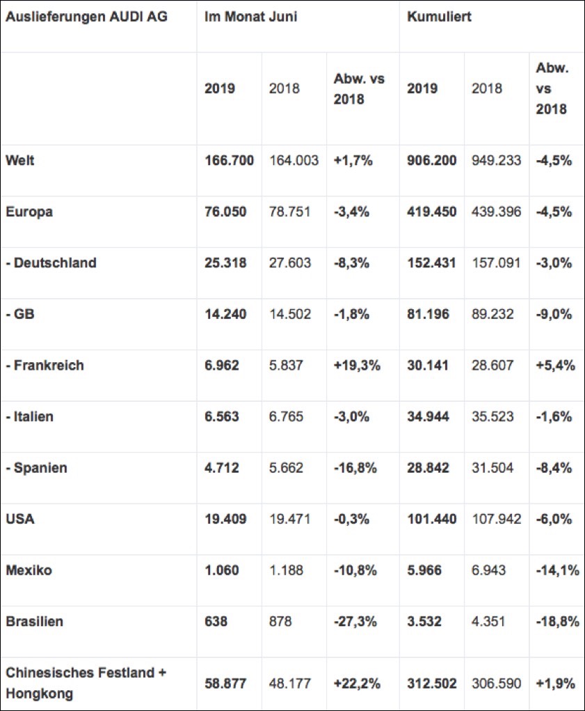 In Europa übergab Audi im Juni rund 76 050 Autos (minus 3,4 Prozent) an Kunden. Seit Jahresbeginn summierte sich die Zahl der Auslieferungen auf rund 419 450 – das entspricht einem Minus von 4,5 Prozent. Positiv verlief die erste Jahreshälfte etwa in Frankreich (plus 5,4 Prozent), Dänemark (plus 23,3 Prozent) und Norwegen (plus 13,7 Prozent). Deutschland schloss das erste Halbjahr mit 152 431 verkauften Fahrzeugen (minus 3,0 Prozent) ab; für Spanien steht ein Minus von 8,4 Prozent zu Buche für Großbritannien ein Minus von 9,0 Prozent und für Italien ein Minus von 1,6 Prozent.