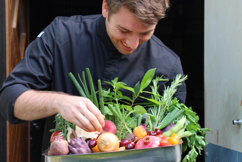 Der Koch Julian Vogt zeigt bei einer Koch-Show, wie man sich aus regionalen Produkten gesund und schmackhaft ernähren kann.