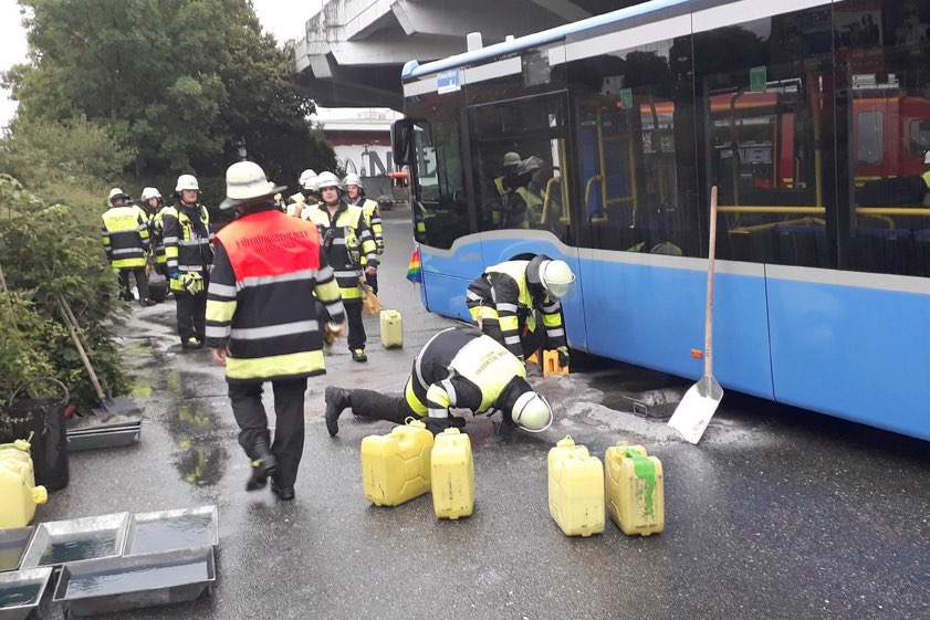 Das Fahrrad der Verunglückten hatte laut Feuerwehr bei der Kollision den Tank des Busses aufgerissen. Was zur Folge hatte, dass rund 250 Liter Diesel auf die Straße liefen. "Der Kraftstoff wurde mit Mulden aufgefangen und mit Ölbinde-Mittel gebunden", berichtet die Berufsfeuerwehr. "Zusätzlich wurden vorsorglich alle umliegenden Gullys abgedichtet, um ein Ausbreiten des Kraftstoffes über die Kanalisation zu verhindern."
