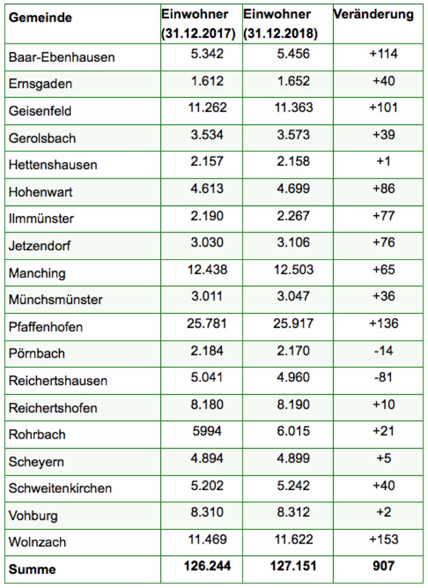 Die größte Gemeinde bleibt unumstritten und mit deutlichem Abstand Pfaffenhofen: Das bayerische Landesamt für Statistik und Datenverarbeitung wies zum Jahreswechsel für die Kreisstadt 25 917 Einwohner aus. Auf Rang zwei folgt Manching mit 12 503 Einwohnern (plus 65) vor Wolnzach mit 11 622 Einwohnern und Geisenfeld mit 11 363 Einwohnern. Alle anderen Landkreis-Gemeinden zählen weniger als 10 000 Einwohner. Der Markt Reichertshofen verzeichnete 8190 Bürger (plus zehn), die Stadt Vohburg 8312 (plus zwei).