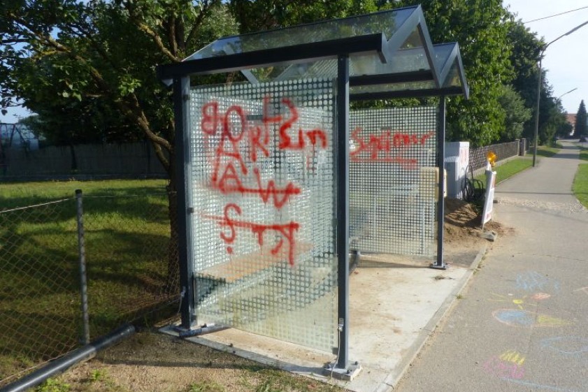 "Der oder die Täter sprühten verschiedene Buchstaben-Kombinationen an die Glaswände, woraus zu schließen ist, dass ein Tatzusammenhang mit den bisher zurückliegenden sechs Fällen besteht", erklärt ein Sprecher der Schrobenhausener Polizeiinspektion zu den neuerlichen Delikten. Ein unmittelbar angrenzender Telefonkasten sei dieses Mal ebenfalls mit roter Farbe besprüht worden. Der Sachschaden belaufe sich diesmal auf mehrere hundert Euro – so hoch werden die Reinigungskosten beziffert.
